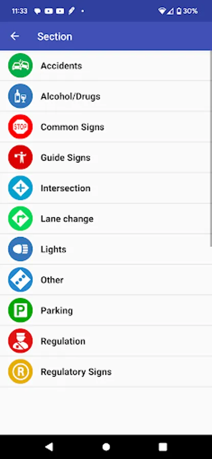 There are several topics in Section, including Warning sign, Alcohol and Drugs, Lane Changes, etc