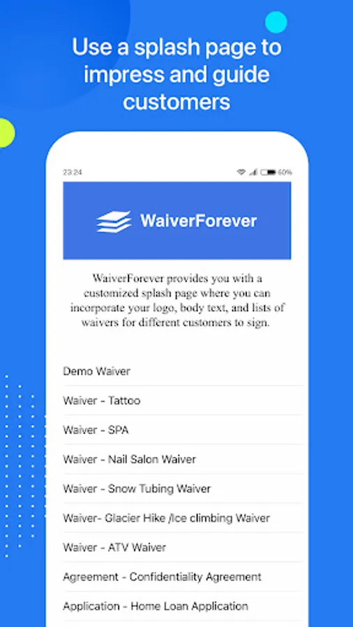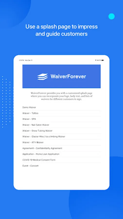 WaiverForever converts piles of liability waivers into digital documents that can be electronically signed. By downloading the WaiverForever app, not only can you turn your iPhone and iPad into waiver signing stations, you can also keep your business organized in the cloud forever and streamline your business by better understanding your customers through data collected by WaiverForever.