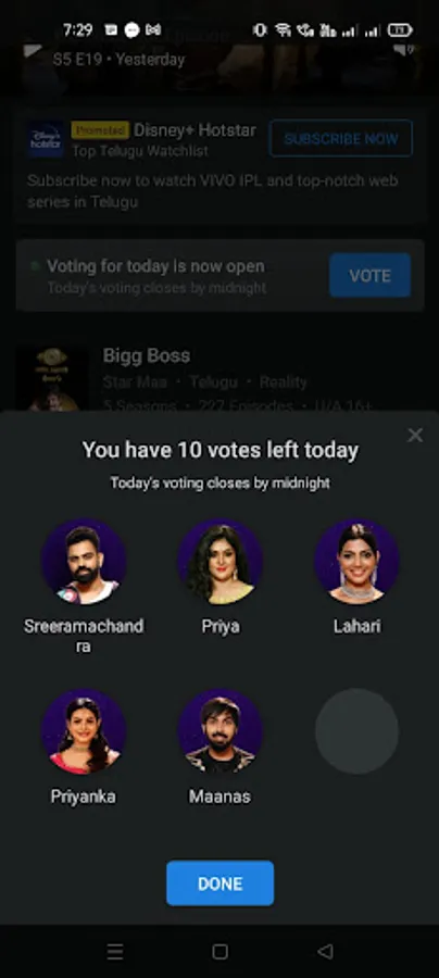 ->Voting through Hotstar for your favourite Telugu Bigg Boss 5 Contestants