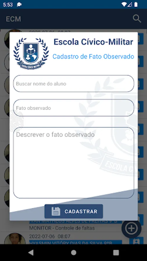 Due to the implementation of the Civic-Military school Prof. Adenocre in Costa Rica, an application is being implemented and made available to register the observed facts of the students, together with the visualization of the attendance records of the Social and Psychological Assistance. So that in the future parents have access to this information.