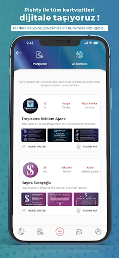 Pishty is the proprietor of this idea as a whole within the scope of the project. It is also the producer and first implementer of the idea of optionally collecting other social media applications under one roof. Thanks to this feature, our application has become a "digital identity" application, as it is not only a virtual business card application, but also incorporates other social media accounts of the user. Under this identity, Pishty offers you the opportunity to use it digitally (ID, business card, resume) in a single application.