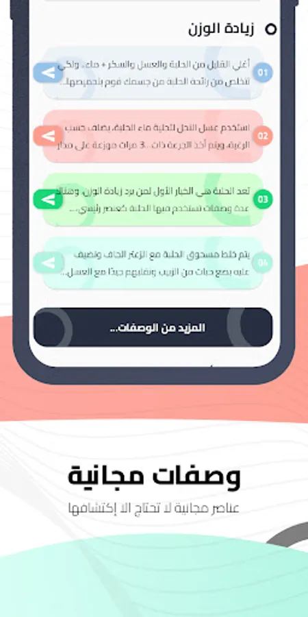 - يحتوى التطبيق على وصفات سلطات و شوربات كثيرة كشوربة الدجاج و غيرها من السلطات و وصفات الشوربات الشهية