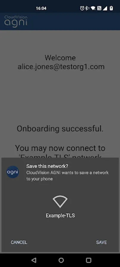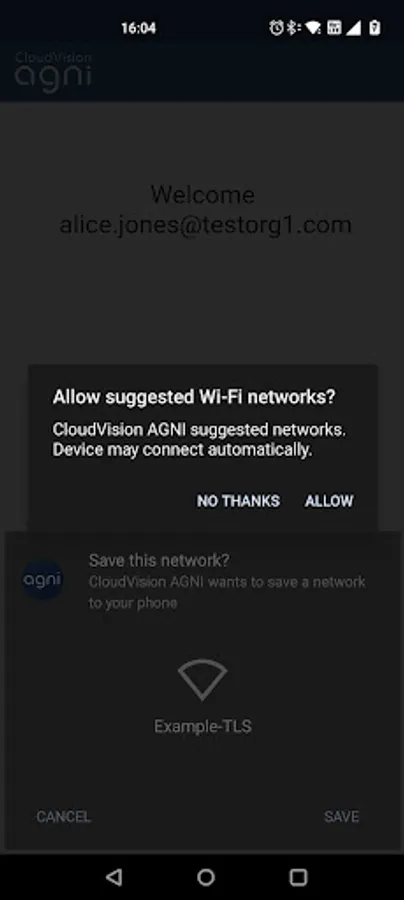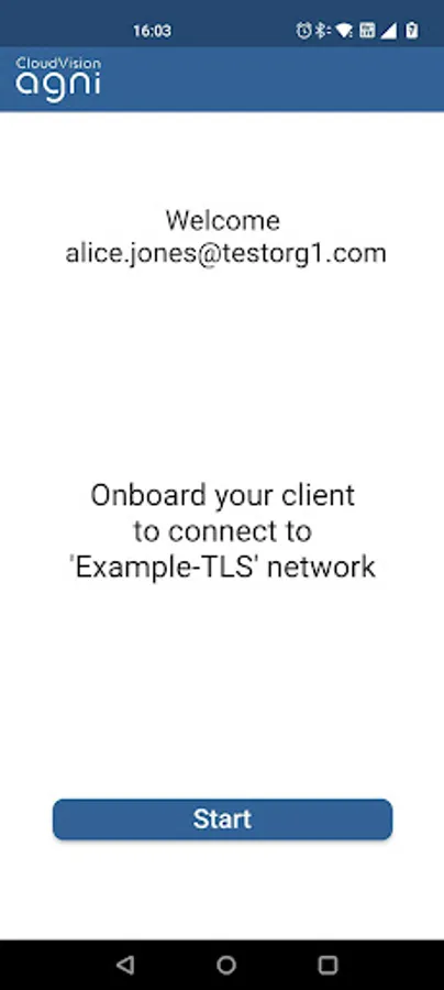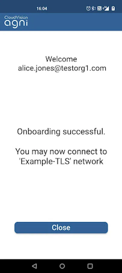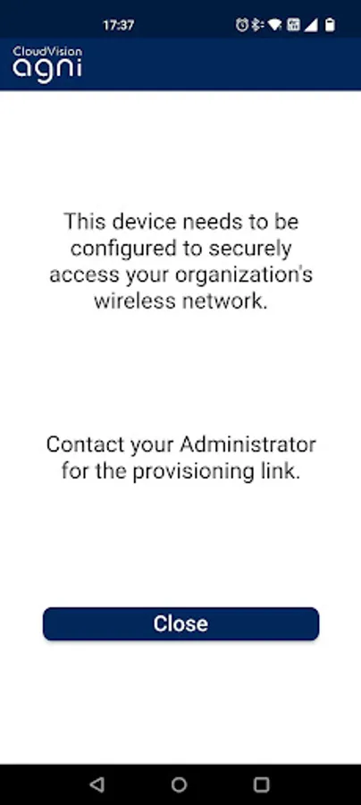 To use the app, users must first authenticate against the self-service portal in the CloudVision AGNI server. Once they are authenticated, they will be redirected to the app. The app will then download the necessary network configuration and certificates from the CloudVision AGNI server and configure the device for secure network authentication.