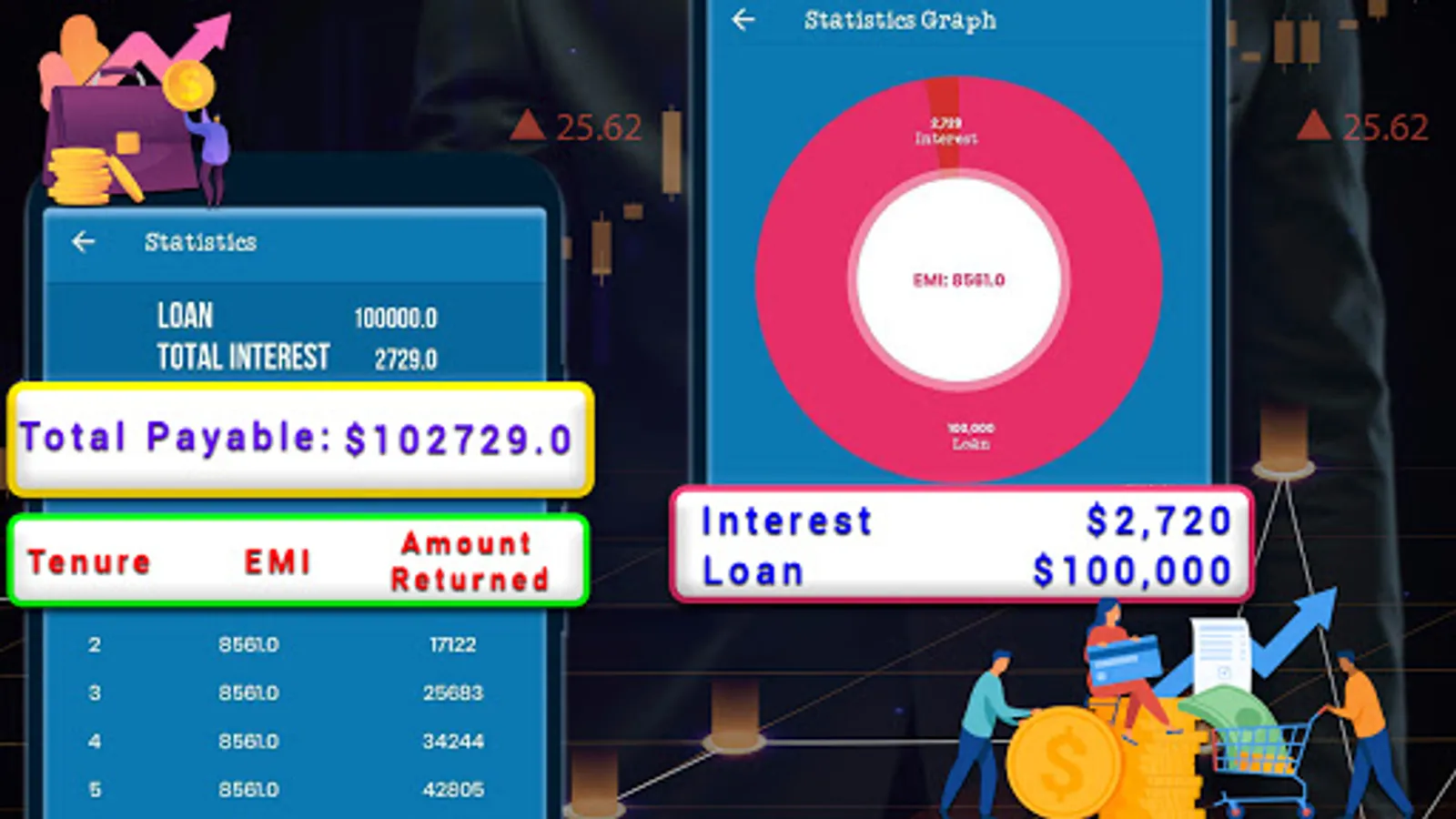 Many Companies & banks offer different conditional interest rate? So you can make your own decision by using lease EMI calculator app will be able to calculate & compare the monthly payment, the amount of interest paid to bank or some companies by the year or month. Just you need to enter the amount of the loan, interest rate & tenure you will be able to see the installment or payment monthly or yearly & you can also view statistics & chart. You will be able to easily calculate maximum 50 years interest rate easily by using repayment loan app.