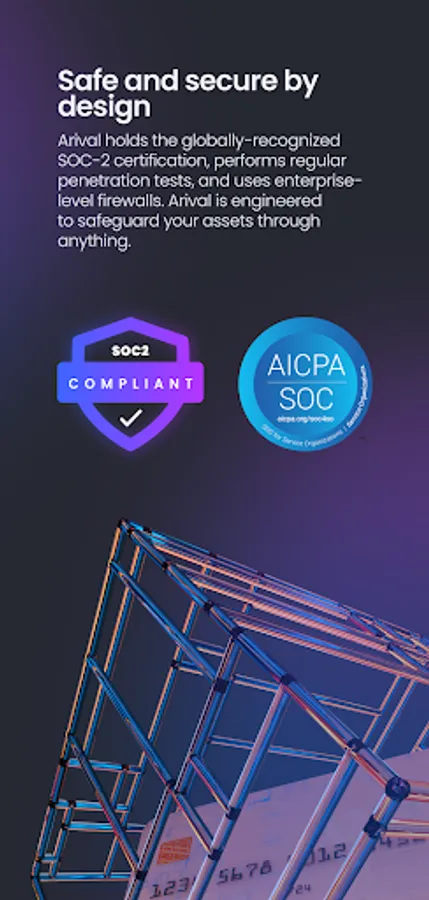 We use 2-Factor Authentication, advanced encryption and perform regular system reviews to keep your data secure. Our safety system is SOC2 compliant, 256 Bit encrypted, and monitored, which means your assets are always safe with Arival Bank.
