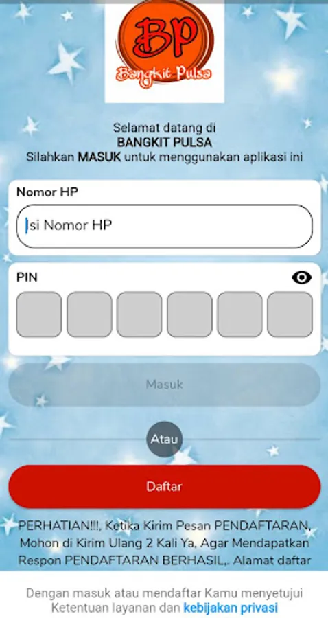Transactions using the Isi Bangkit Pulsa application can be carried out for 24 hours non-stop except when there is a direct disturbance from the provider, or is under maintenance.