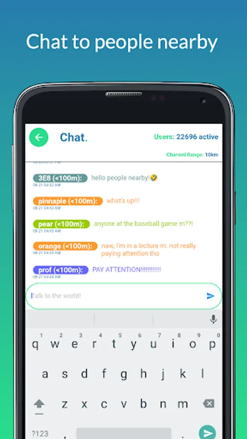 The location based chat lets you talk to anyone within a, 500m, 10km, or 100km radius of you! This feature is perfect for large social gatherings, like sports, concerts, or events. Instead of just talking to people who can hear you, Rambl lets you talk to anyone within your specified radius.