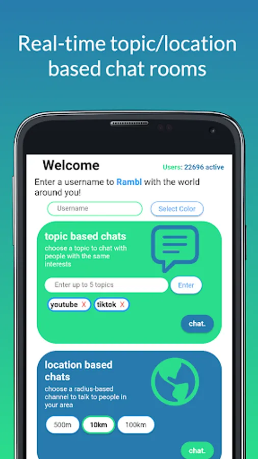 Rambl is a series of chat rooms where you can talk to people within a certain distance from you or to the world about a certain subject. Rambl gives any location or topic a realtime public chatroom!