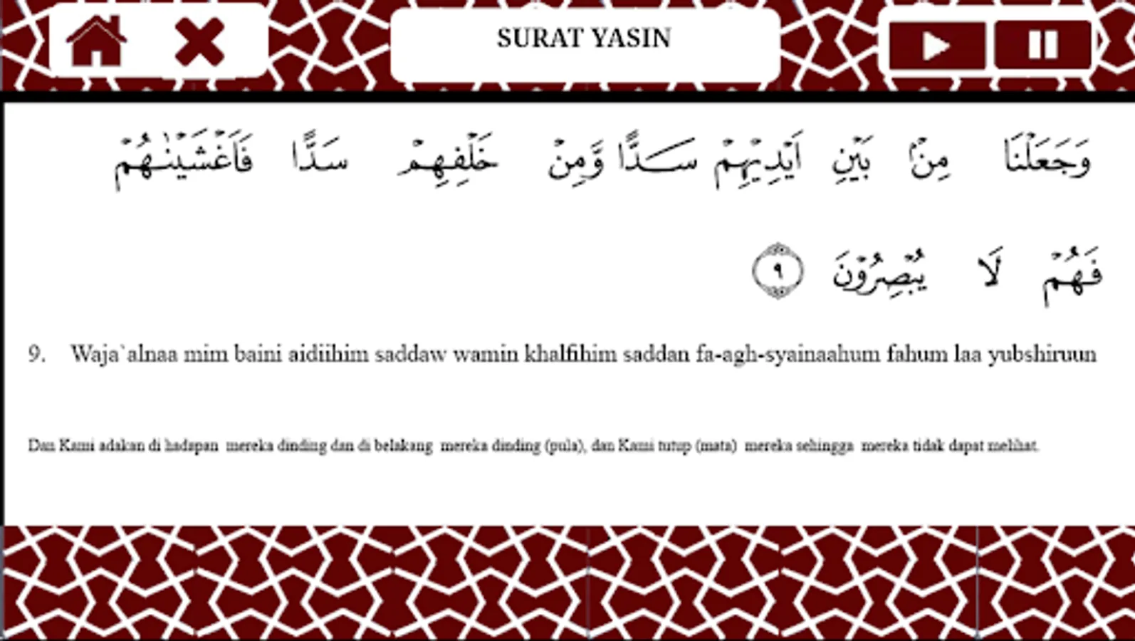 This application contains a yasin letter read by Shaykh Misyari Rasyid. This application makes it easy to read the Yasin letter where the appearance of this application is a landscape with larger letters so that it is easy to read. This application also features how to read and translate the Yasin letter
