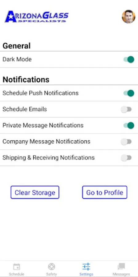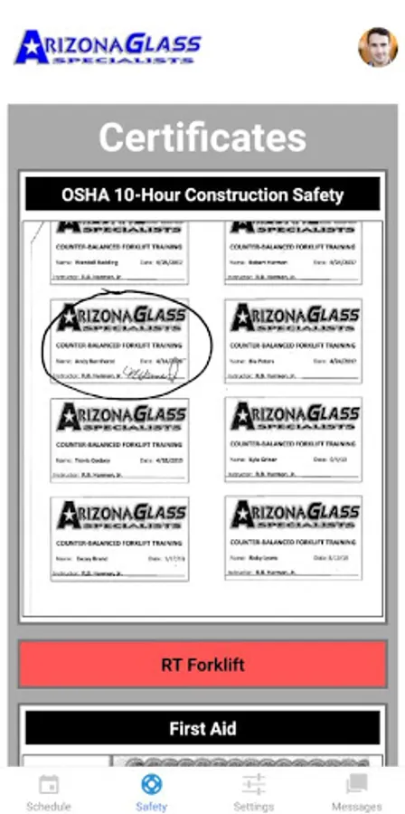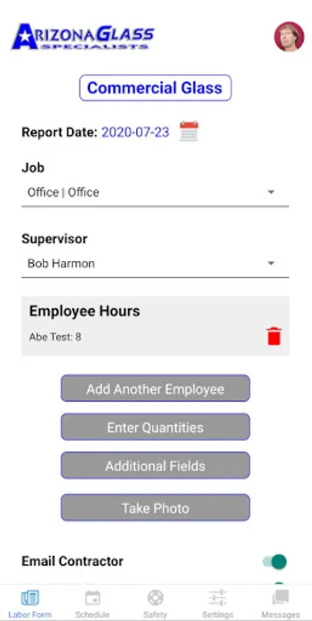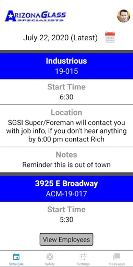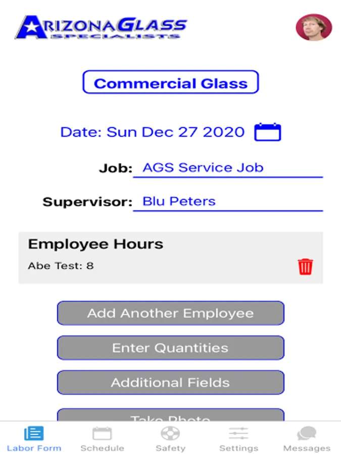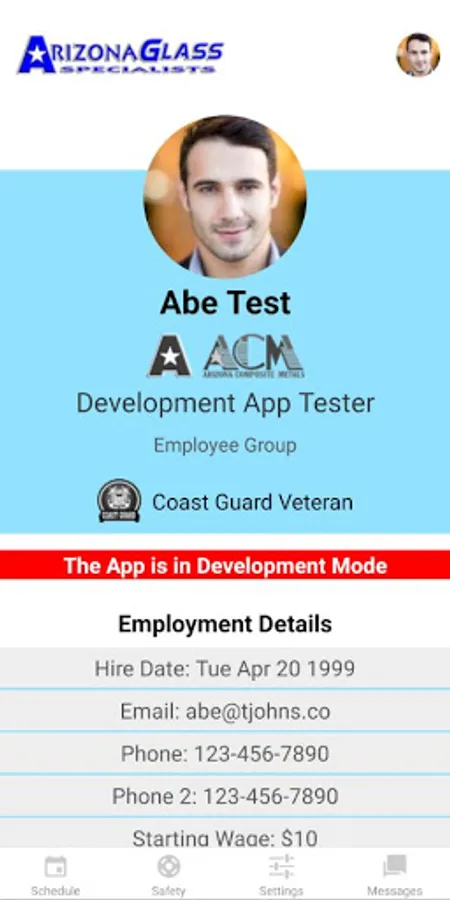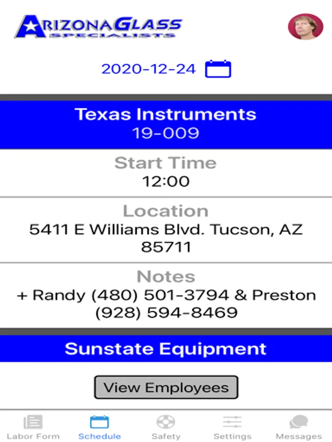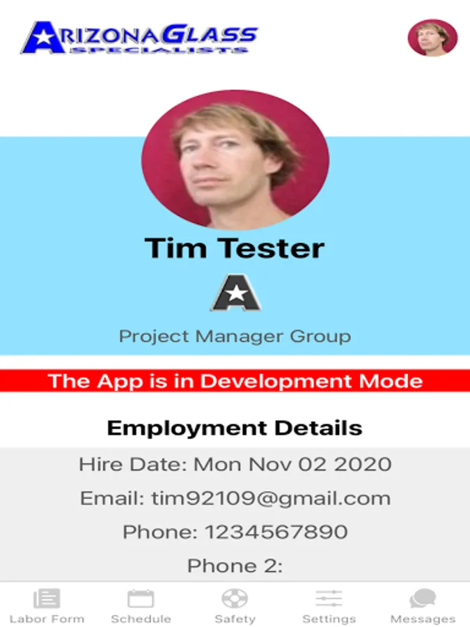 For internal uses. Screens include Profile, Labor Forms, Schedule, Safety Item Retrieval, Settings & Messaging.