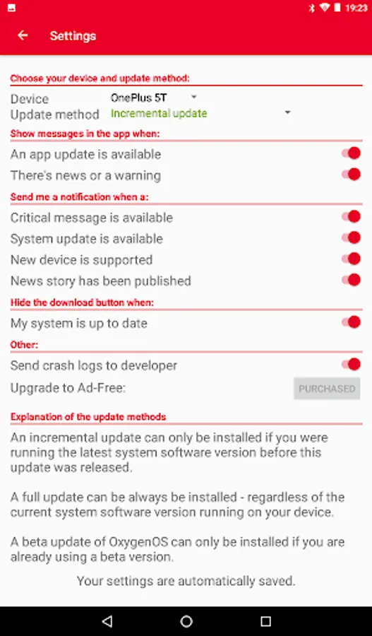 Oxygen Updater is an open-source app supported by ads & donations. Ads can be removed by purchasing the ad-free unlock in the app’s settings.