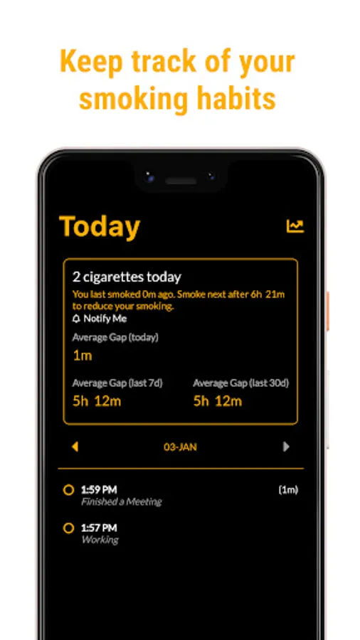 Quitting smoking is hard, we know! Or maybe you don't want to quit, but just keep it under control. Either way, the first step is to understand how much you smoke and what triggers your cravings. Break Free tracks your smoking habits and provides you with a better understanding of your smoking patterns.