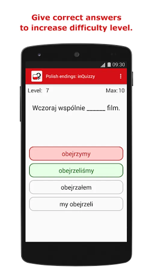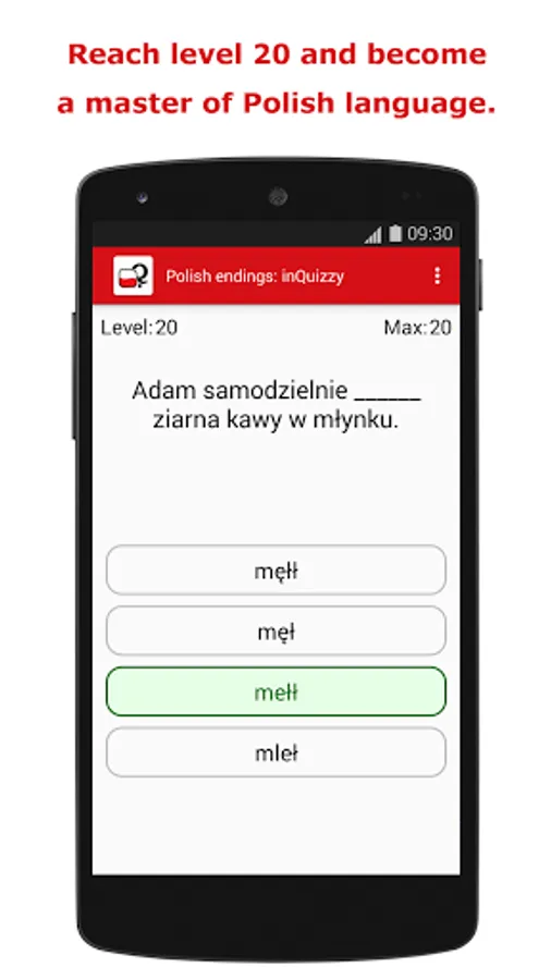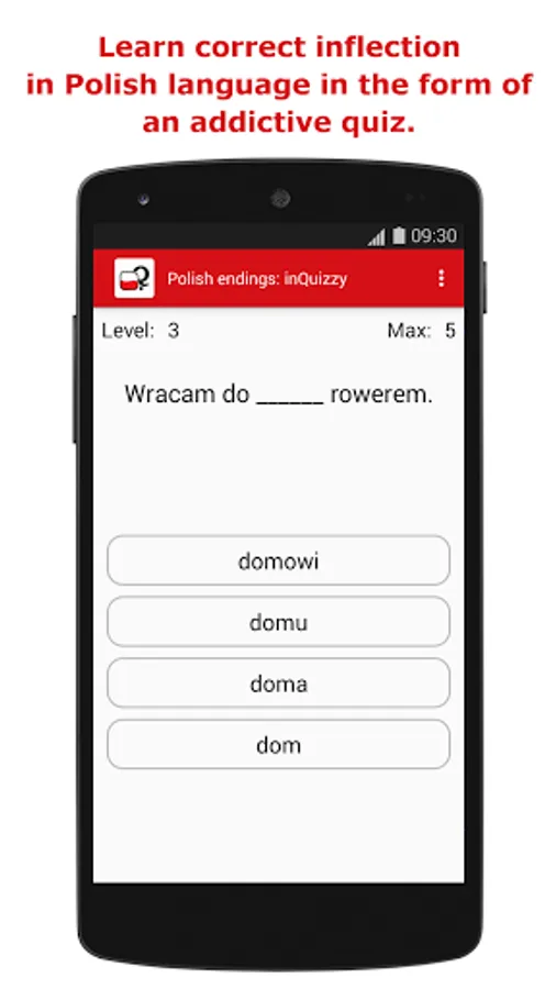 Polish endings: inQuizzy app enables your practical learning of Polish in the form of a quiz. Your task is to complete the sentences with the missing word in the appropriate form. Three correct answers in a row increase the difficulty level, and the wrong answer drops you to a lower level.