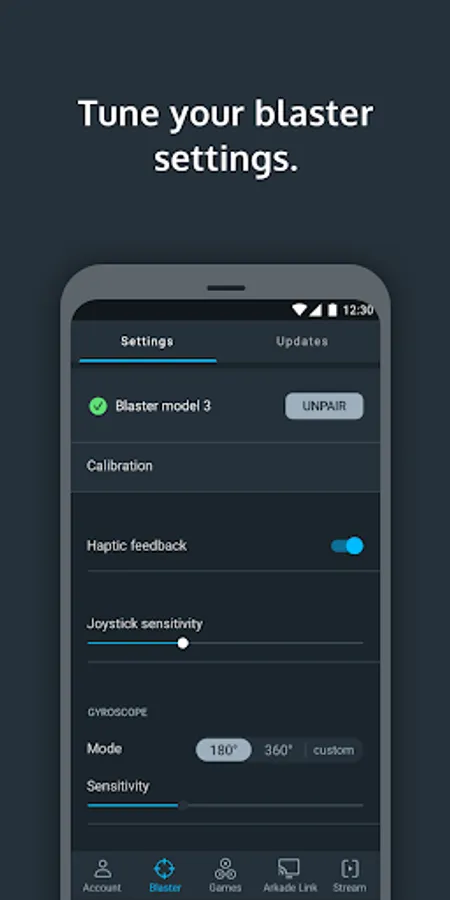 Connect your blaster to the Arkade app and configure advanced blaster settings such as sensitivity, configuration, and more. Check for updates, control the LEDs and haptics.