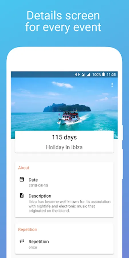Set a reminder for each event to make sure that you don't commit a blunder! Download now and start counting today to stay informed about your events and days.