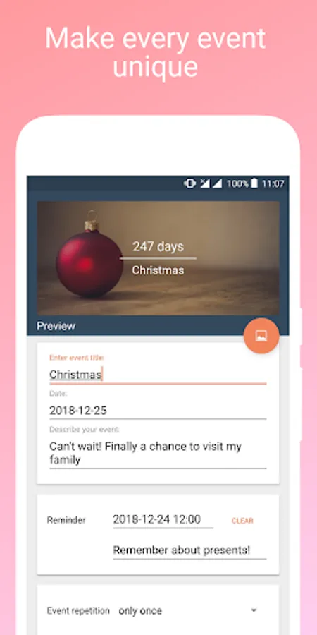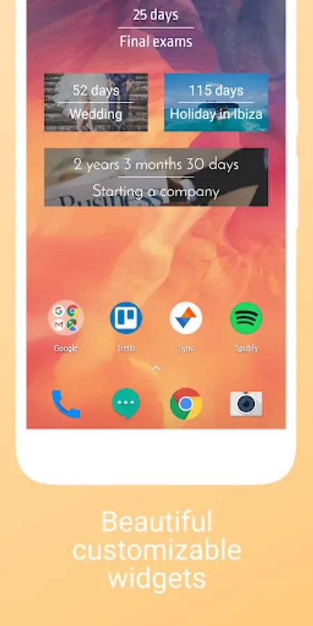 Create a highly customizable widget on your home screen and be able to count the most important days end events every day right in front of you.