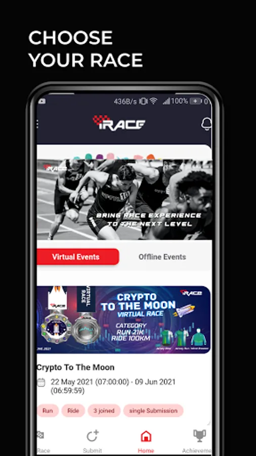You can now compete with many events like running events, cycling, walking, jogging, workout events etc in virtual race app. After logging in our virtual event app you will have to choose the event in which you like to participate among many events. After selecting the event you will have to choose the category and you will do registration for that event in virtual race app . Do different kind of challenges anywhere, everywhere using tracking apps or a tracking device which you will have put it on your hand, or you will have to open tracking app on your mobile in virtual event app. After completing the event the participants will have to submit the result. The winner will be rewards with medals which we will send it through courier in challenge app. Hurry up start participating in event to win awards in our virtual event app.