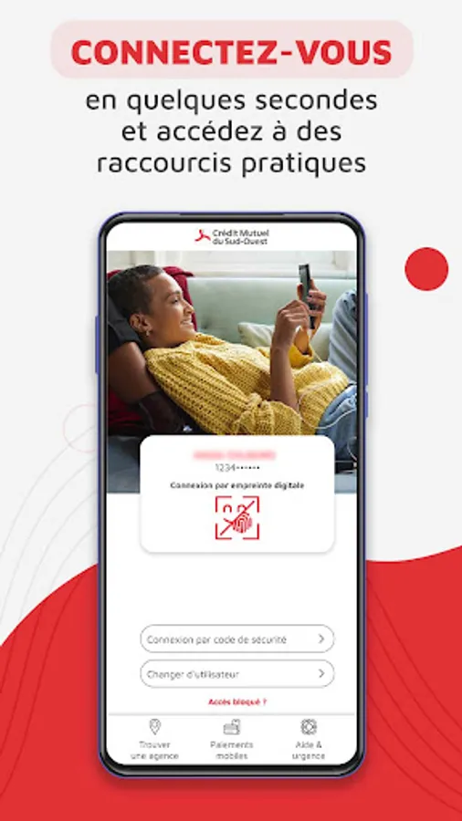 (2) Connection to our application using your fingerprint is possible thanks to the technology offered by your Smartphone, if it is equipped with a fingerprint sensor, and after activating the functionality. Crédit Mutuel du Sud Ouest does not keep your fingerprint, it remains stored in the memory of your Smartphone.