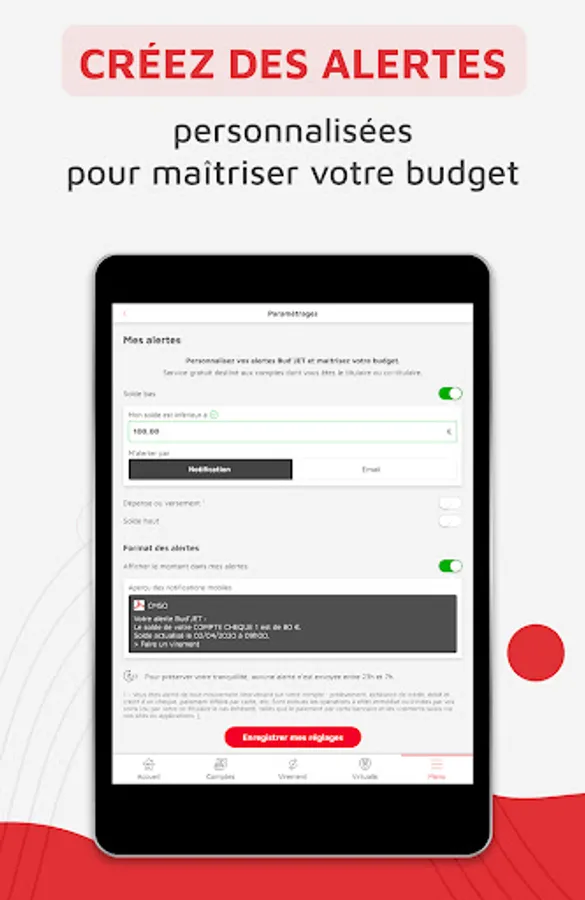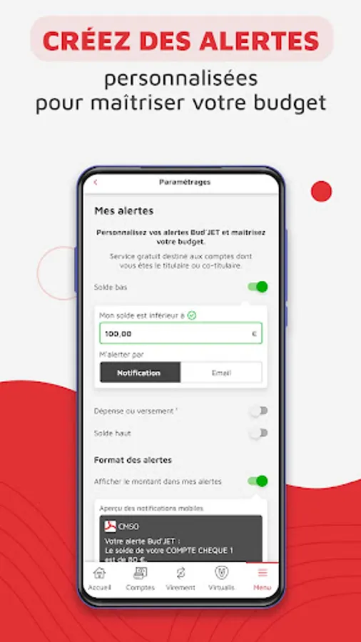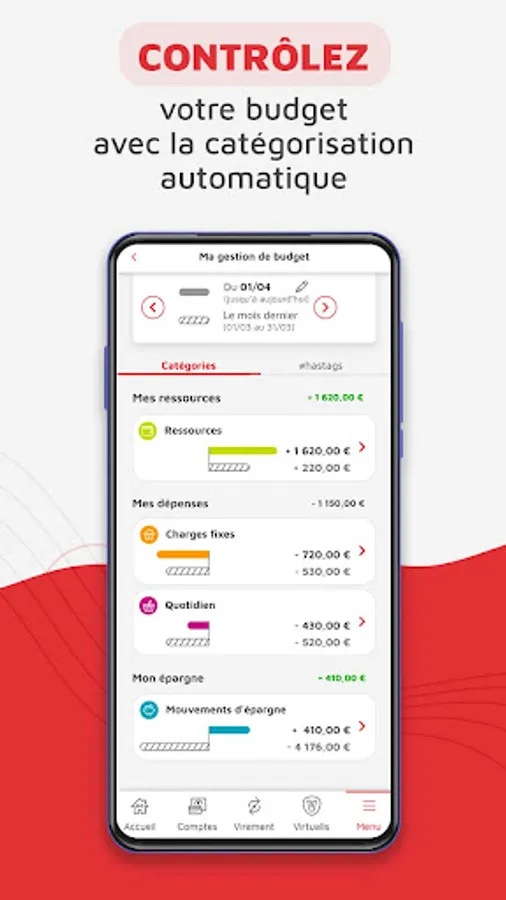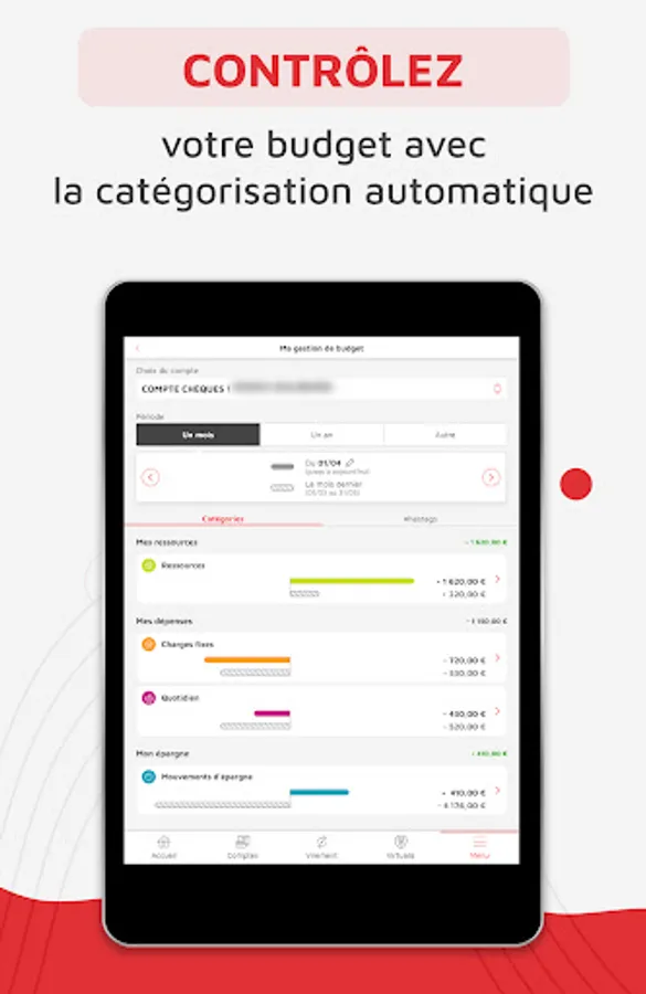 • Access budget management tools: personalized alerts, balance info, activation of automatic categorization of your transactions, aggregation of external accounts.