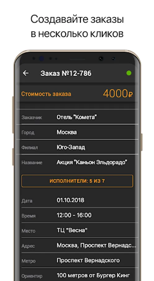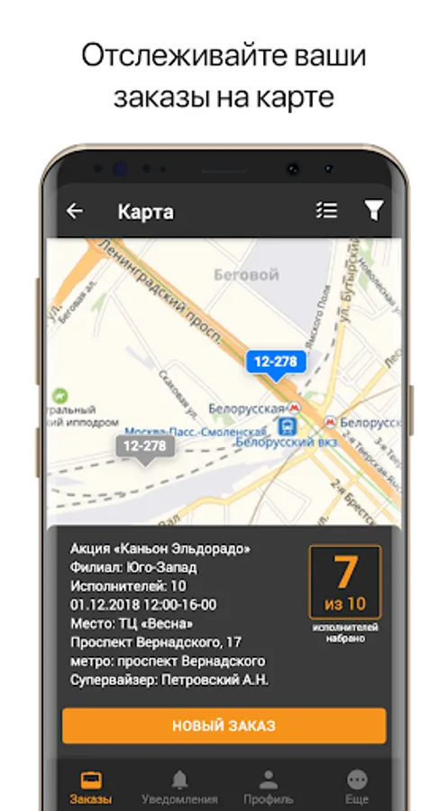 You can always find promoters near the venue of the planned action. Order status is monitored in real time, a push notification will inform you of all changes. The application helps to control the situation so that you are sure that your order is 100% complete.