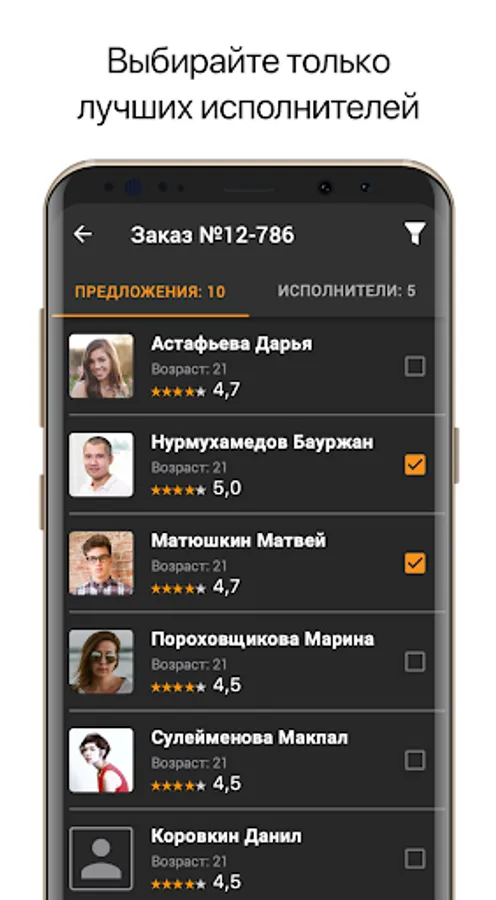 You can invite a specialist by placing an order with a description of the tasks from your mobile phone. Next, you choose artists, or get feedback from interested users. The application allows you to filter performers according to your desired criteria and form a team that is ideally suited for performing tasks.