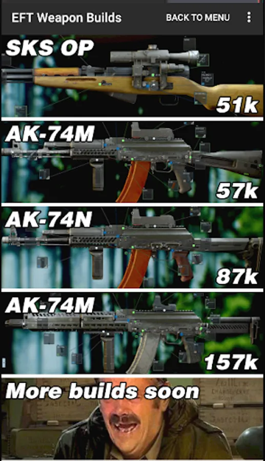 Are you trying to Escape from the hellish Tarkov but are you struggling with finding the right kit to bring to raid with? Well look no further because with this community made application you will find the best builds for the money. Including Weapon and Armor builds, maps, hidden stashes and tips and tricks!