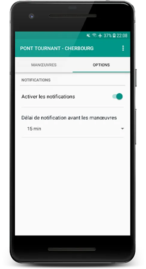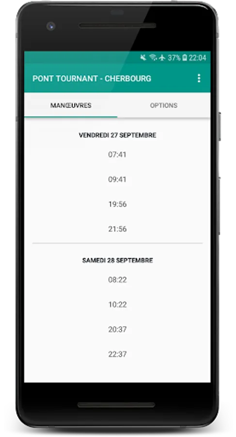 The application informs you of the bridge maneuver schedules turning Cherbourg for the current day and the next two days.