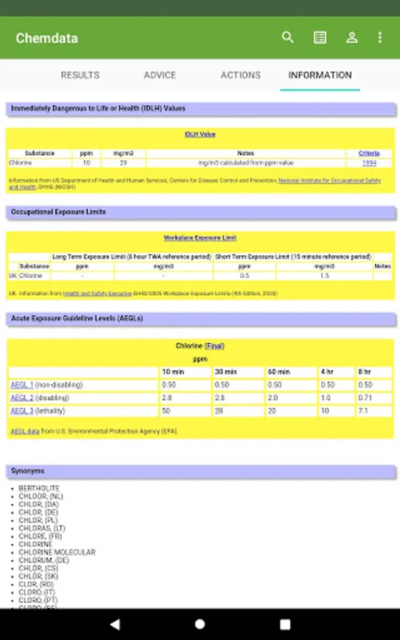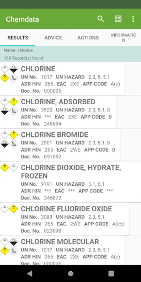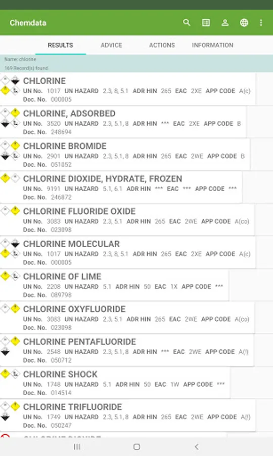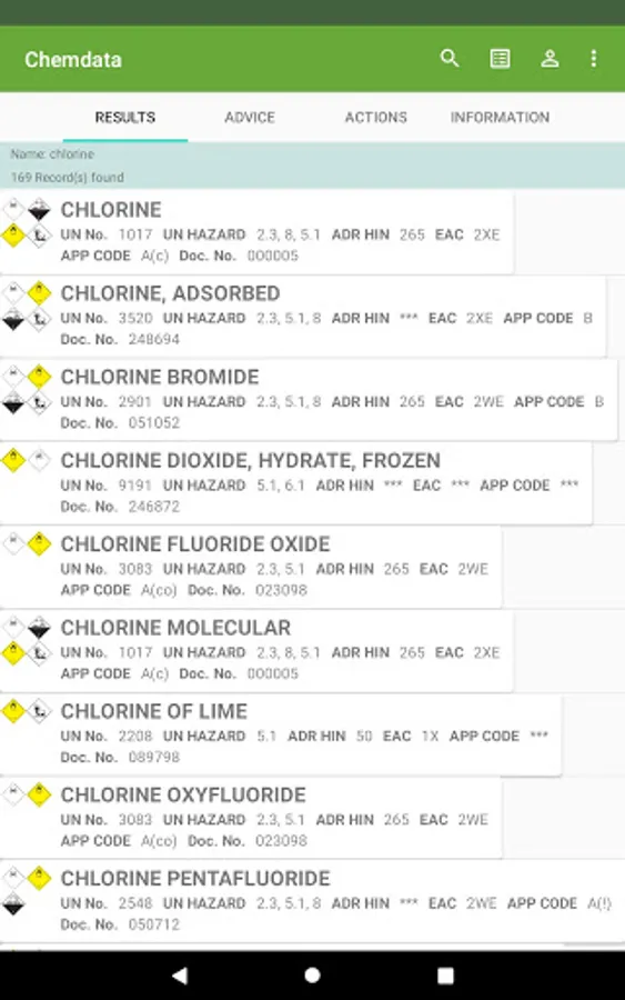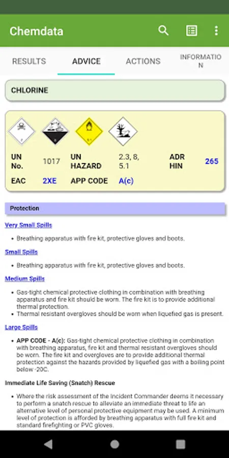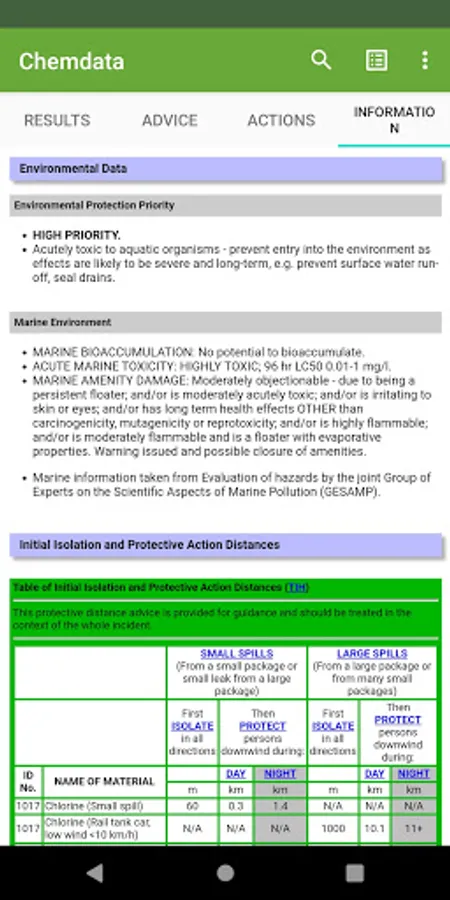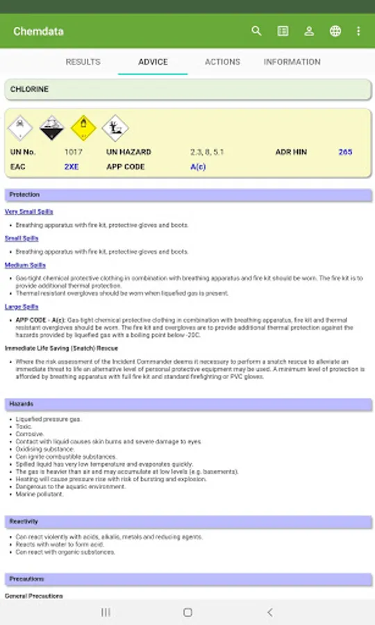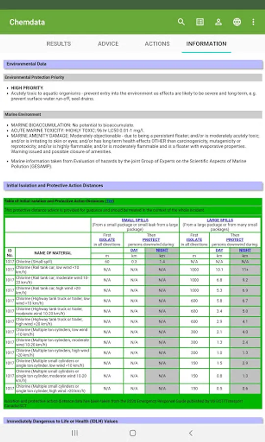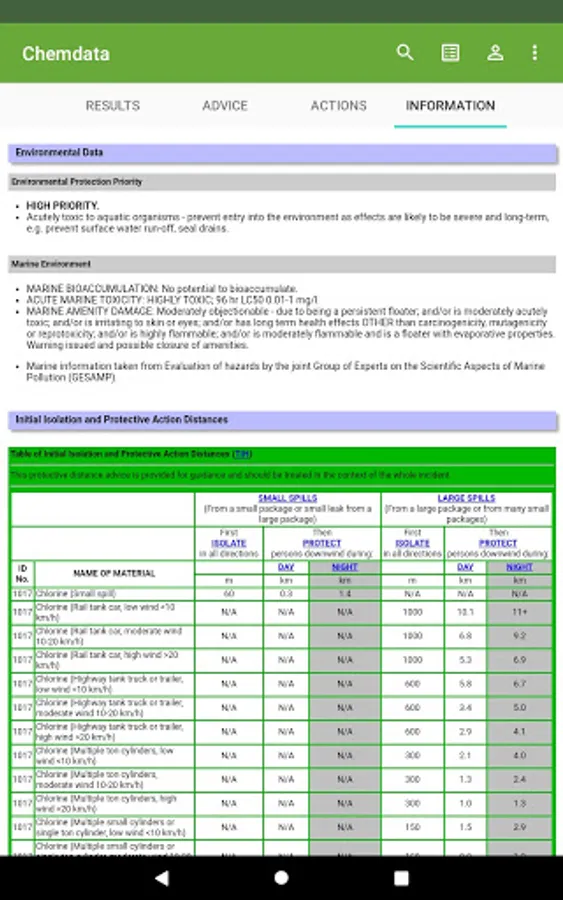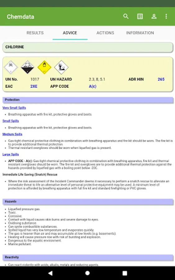 The free app provides access to one full record, to demonstrate the full capabilities of the system, this can be found by searching for the ‘Chlorine’ record or document number 5. Existing subscribers can unlock full access by obtaining an Organisation ID directly from NCEC and logging in to their organisation’s account. Contact us by email, ncec@ricardo.com or via our website https://the-ncec.com/en/emergency-response/chemdata-database