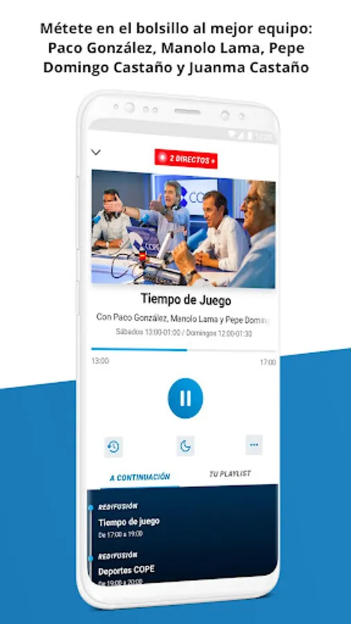 And giving your all is everything. All the matches of LaLiga, the Champions League, the Europa League, the Copa del Rey or the Spanish Soccer Team, the Endesa Basketball League, the NBA or the Euroleague with the exciting stories of Xuancar, the Davis Cup of tennis, the Masters 1000, the Australian Open, Roland Garros or Winbledon, Formula 1, cycling, Handball, Golf… All this and all these you will find in the new Game Time app, equipped with the most robust player on the market so that you can listen to the radio with the best quality and stability. Game Time, Saturdays from 1:00 p.m. to 1:00 p.m. and Sundays from 12:00 p.m. to 1:30 p.m. El Partidazo de COPE, directed by Juanma Castaño, from Monday to Friday, at 11:30 p.m. And Deportes COPE, from 3 pm Monday to Friday, with José Luis Corrochano.