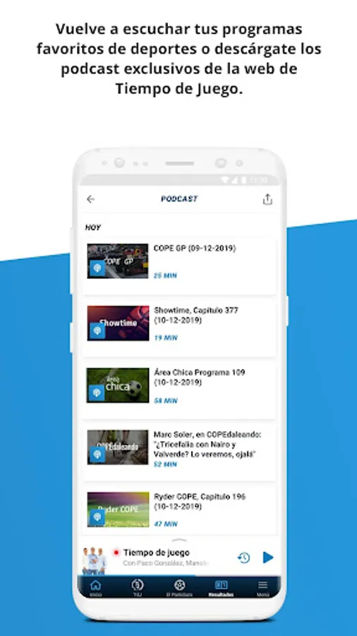If you miss it live, don't worry: in the new app you will find all the delayed programs so that you can listen to them whenever you want, you can even download or forward them by mail or in RRSS. We remind you to also listen to the selection of podcasts of different sports that you will find in the application, and that range from Futsal to Showtime, through Tercer Tiempo, Ryder COPE, COPE GP, COPEdaleando or De Rosca.