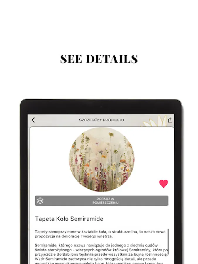 The WallArt AR app allows you to apply and customise in real time unique wallpapers on a customised and circular basis to a surface scanned with your device's camera. See your chosen interior in multiple views and choose a wallpaper perfectly suited to your living room, bedroom, kitchen or even bathroom! Change wallpaper patterns directly on the wall of your choice, view your arrangements from different perspectives and share their photos with friends. With one click, you are taken directly to the wallpaper page of your choice in the online shop.