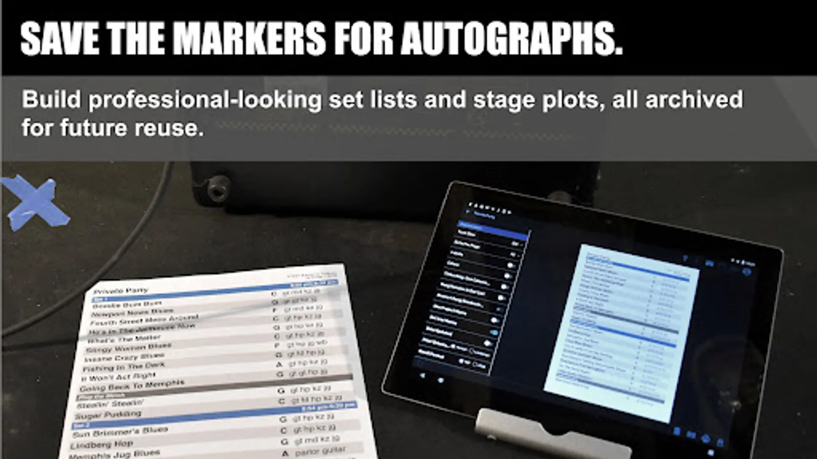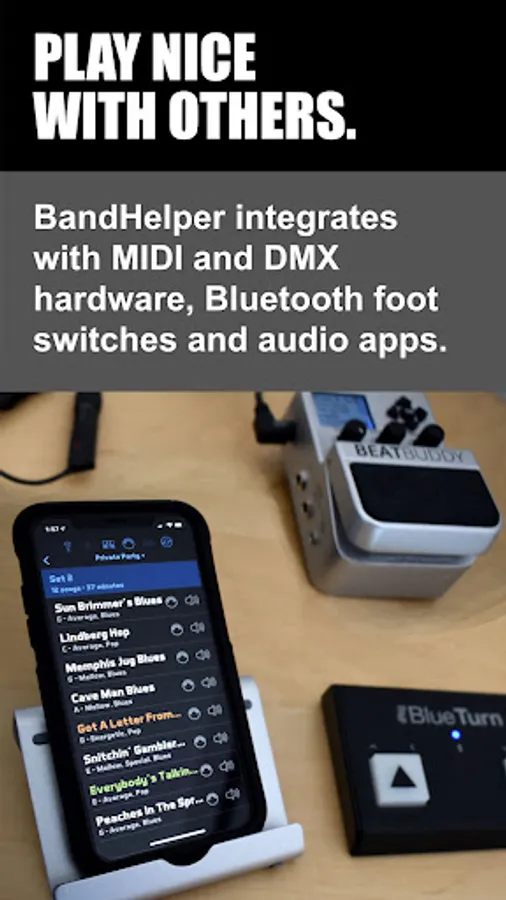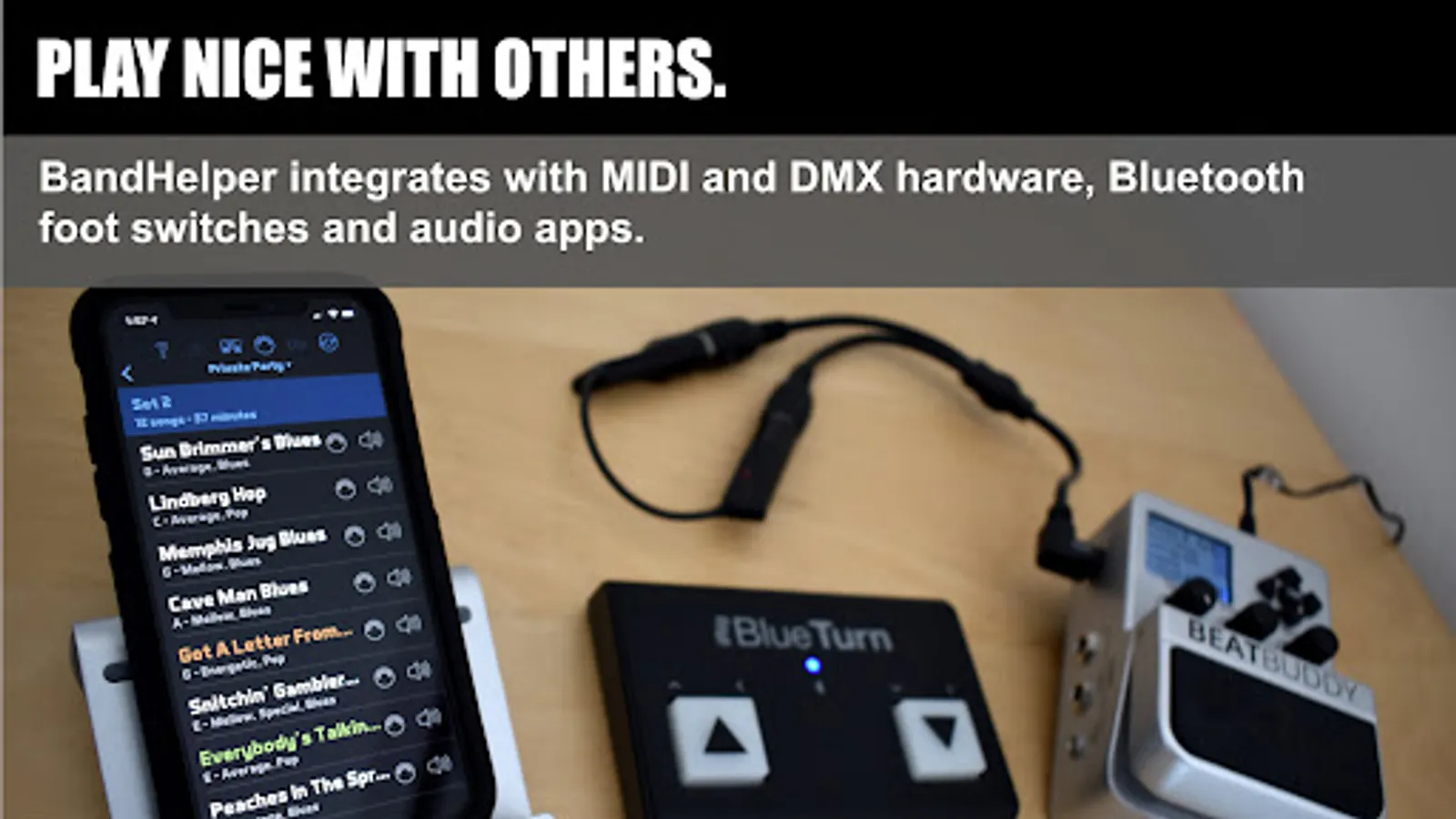 BandHelper can stay behind the scenes with band management, or join you in the limelight. Follow a set list, or choose songs on the fly. Auto-scroll lyrics, play backing tracks and click tracks, and configure sound and lighting equipment with MIDI as you move from song to song. You can control BandHelper with a foot switch, and link your bandmates' devices so all your screens move together while you perform.