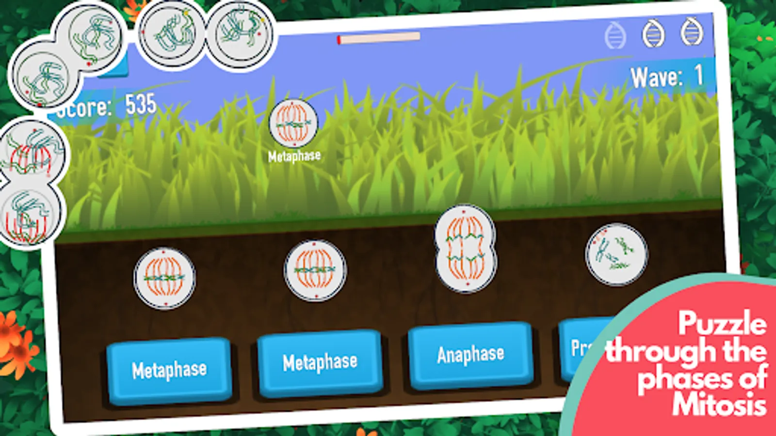 Learn about the different steps in mitosis to better understand cell division. Players learn the order of cell division while playing a matching style game to build cells. While dividing cells, players are familiarised with the position of the chromosomes and how genetic information is moved within the dividing cell.