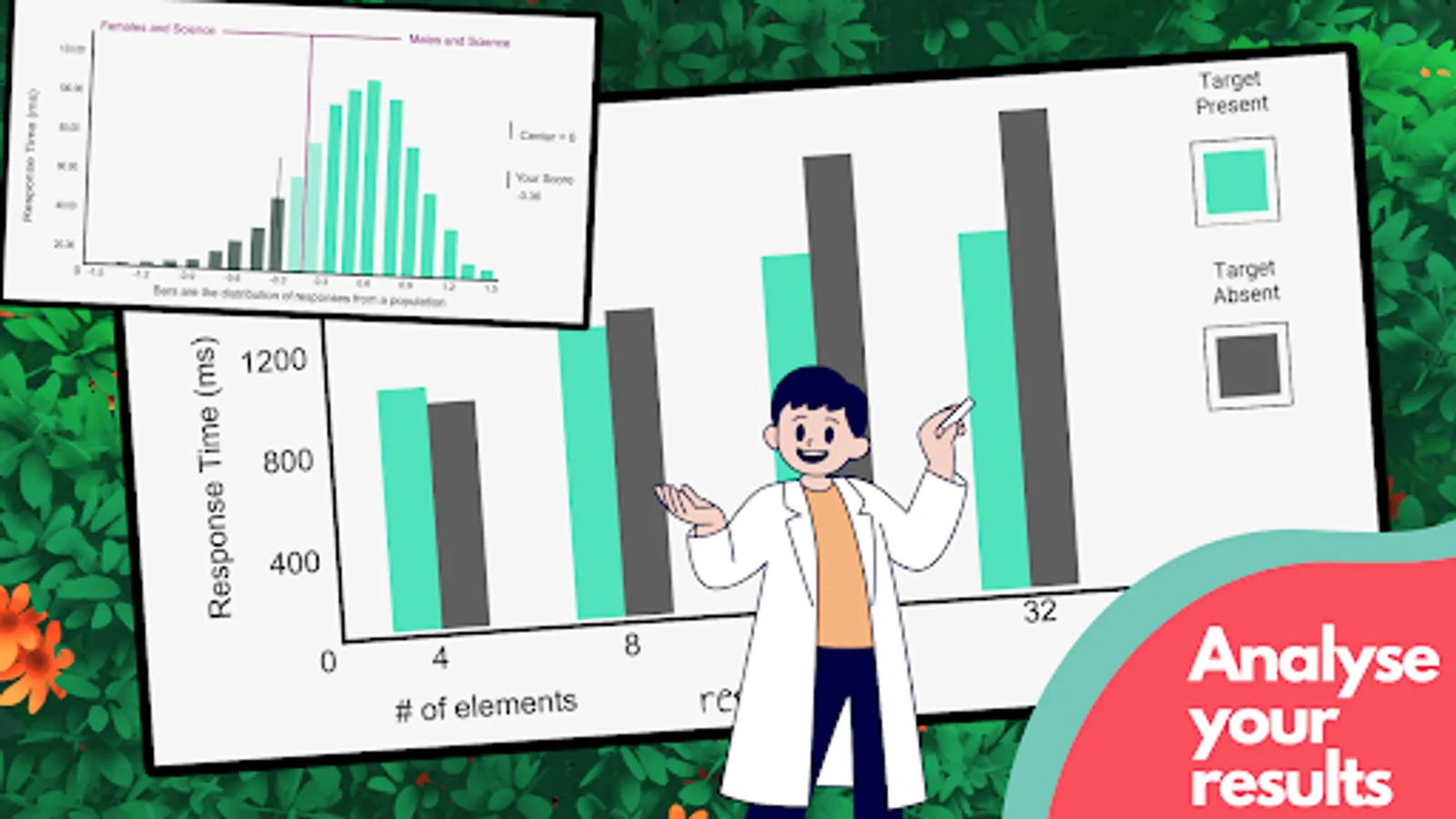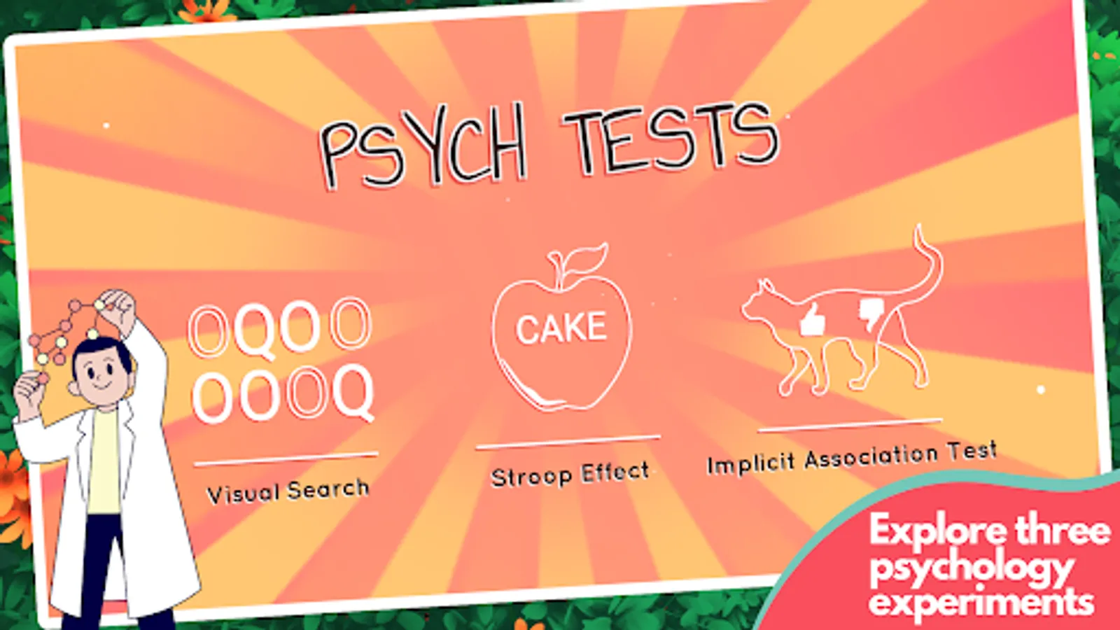 Run classic psychology experiments with Psych tests. Test your reaction speed with the Stroop Effect word game, explore the effects of distractors in the Visual Search mini game, and learn about unconscious biases in the Implicit Association Test.