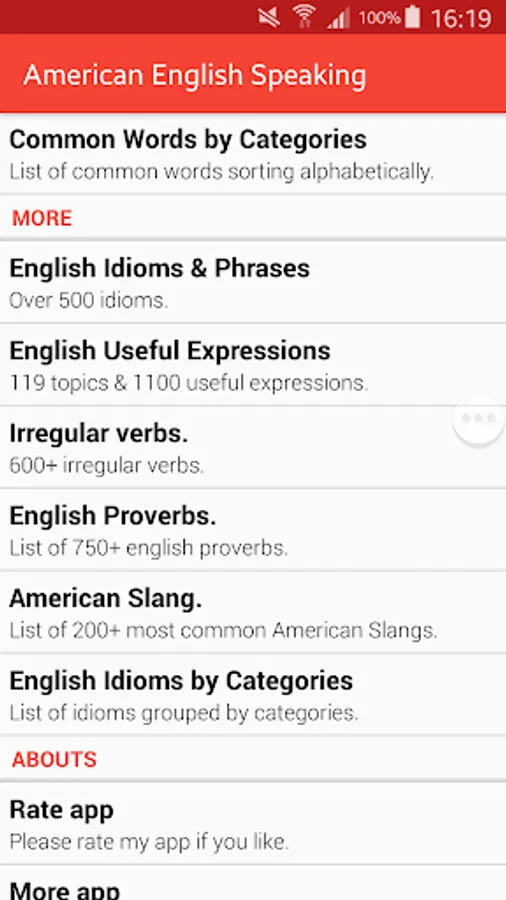 Moreover, you can boost your English vocabulary by learning new words in various topics such as airport, bank, colors, shops etc. These phrases or expressions can be used not only in your daily conversation but also in academic writing. All phrases and expressions in this app are based on Britain English.