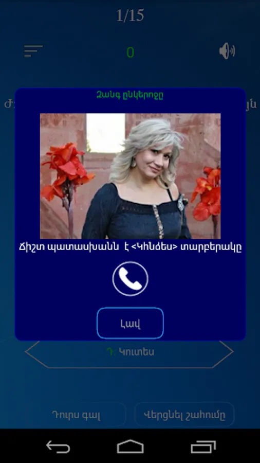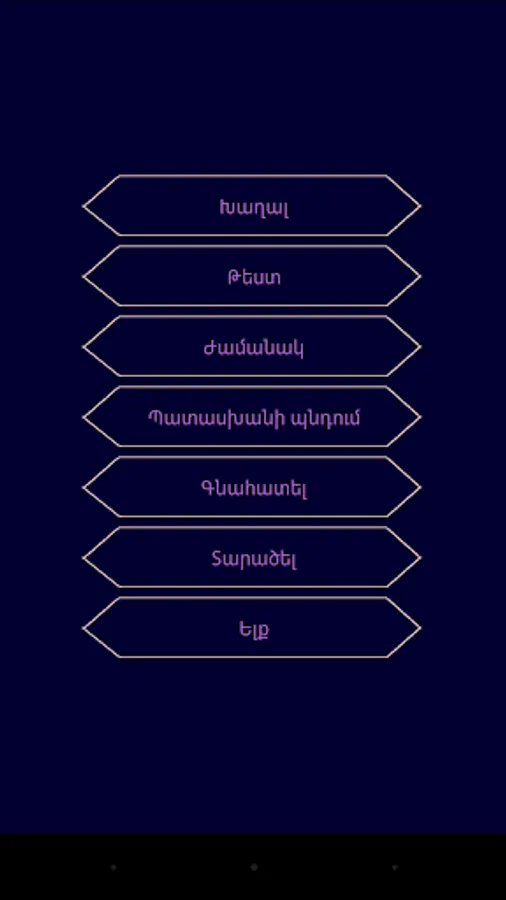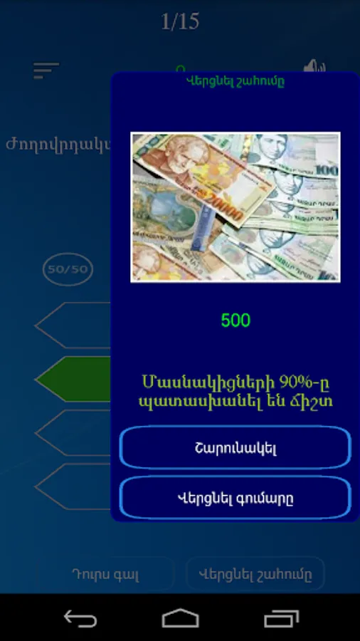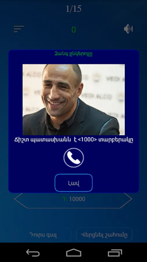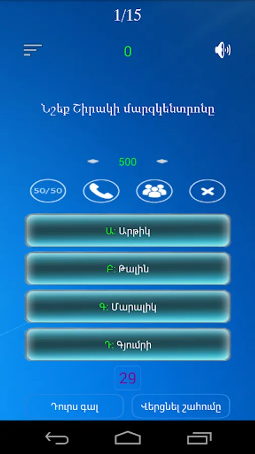 The game has 15 questions. Each issue has 4 variants, only one of which is correct, the participant must choose only the right option from 4 options, which will bring him money.