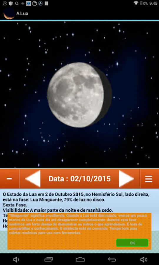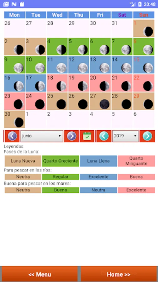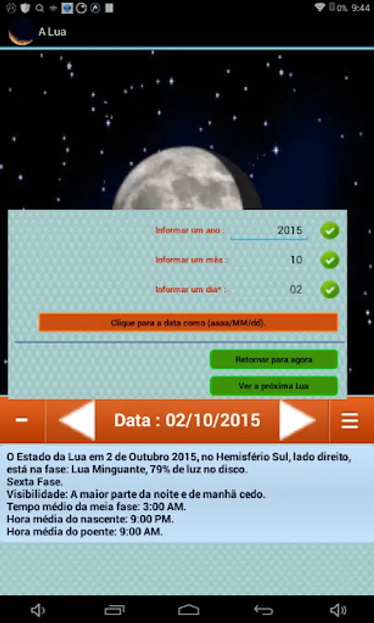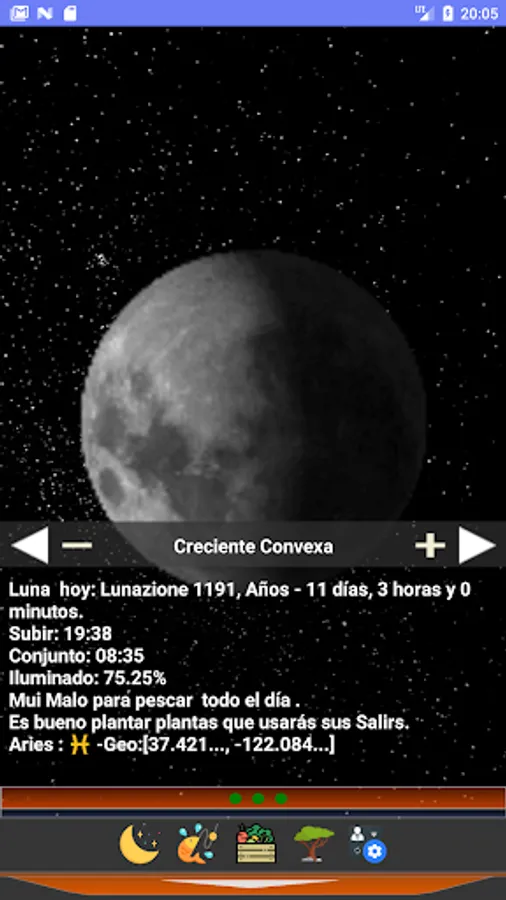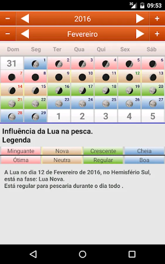 The calendar opens with today's date, choose a year, a month and choose a day in the calendar, choose to see details of the Moon, tips for planting flowers and vegetables, and tips for good phase of the Moon for fishing.