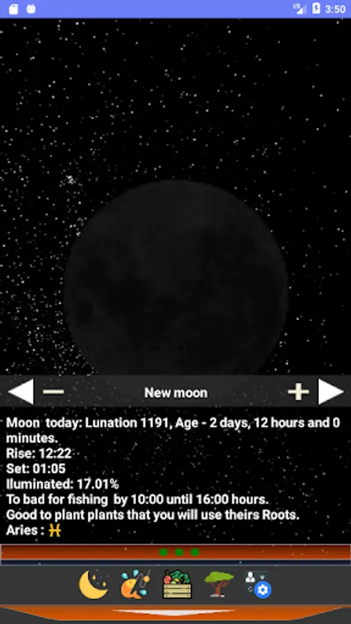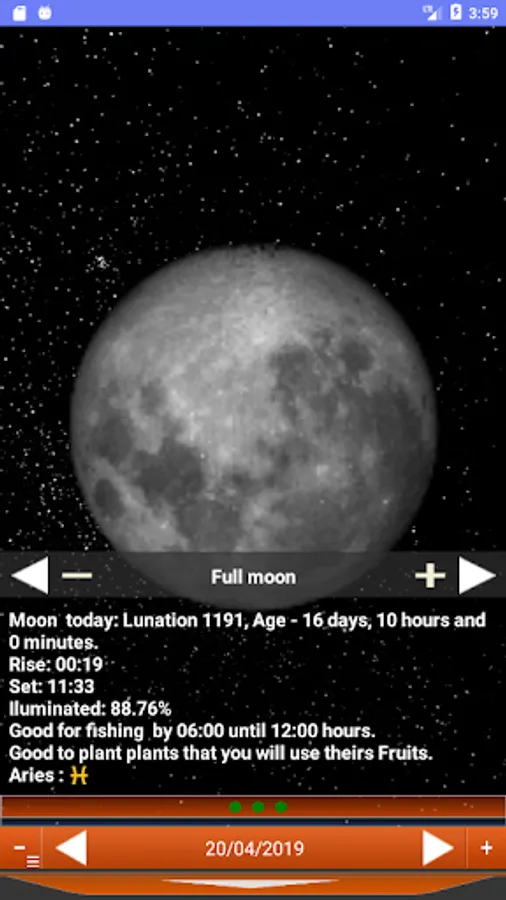With the Organic Lunar Calendar application you have in hand the phase in which the Moon was, is or will be according to a chosen date.