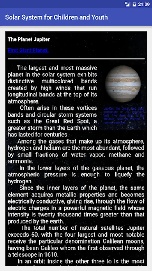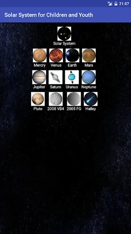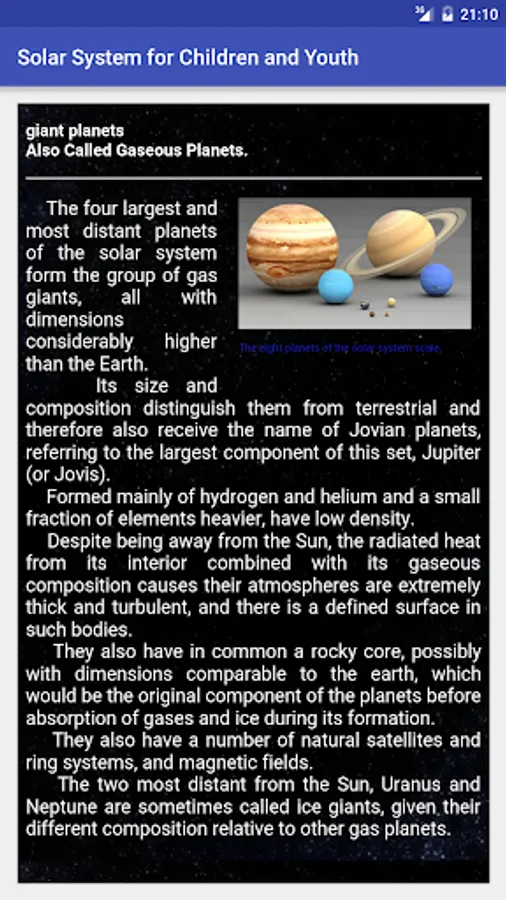 With the Solar System Children and Youth you have a real vision of the movement of [orbits of the stars in our solar system with detail of the moving range of each planet, as well as a brief description of the chosen planet.