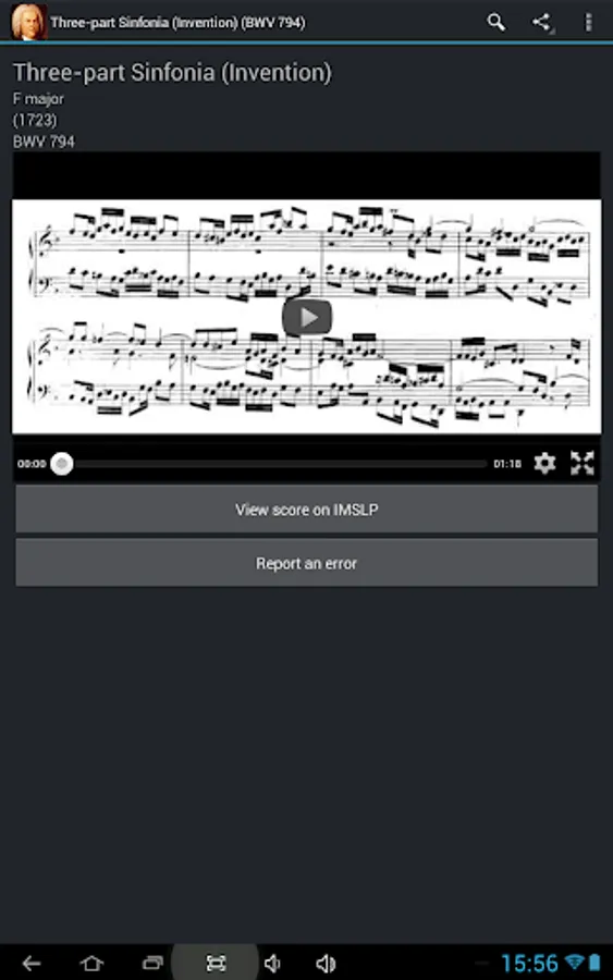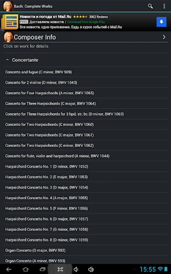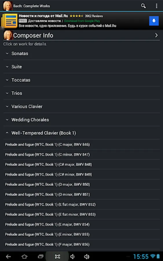 If you love classical music - this app is definitely designed for you! This app includes the complete list of works by Johann Sebastian Bach, according to the BWV catalogue, with free music, videos and scores for almost every composition.