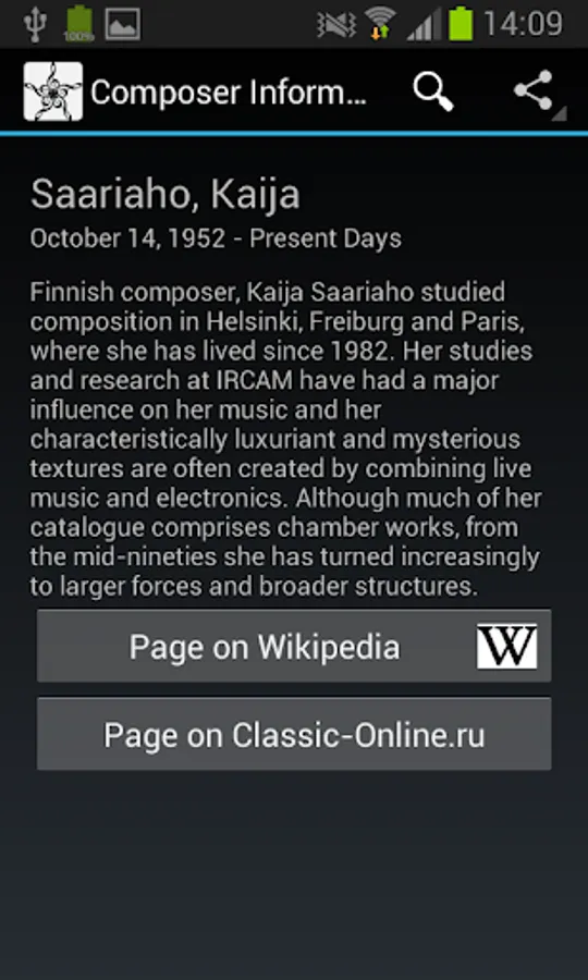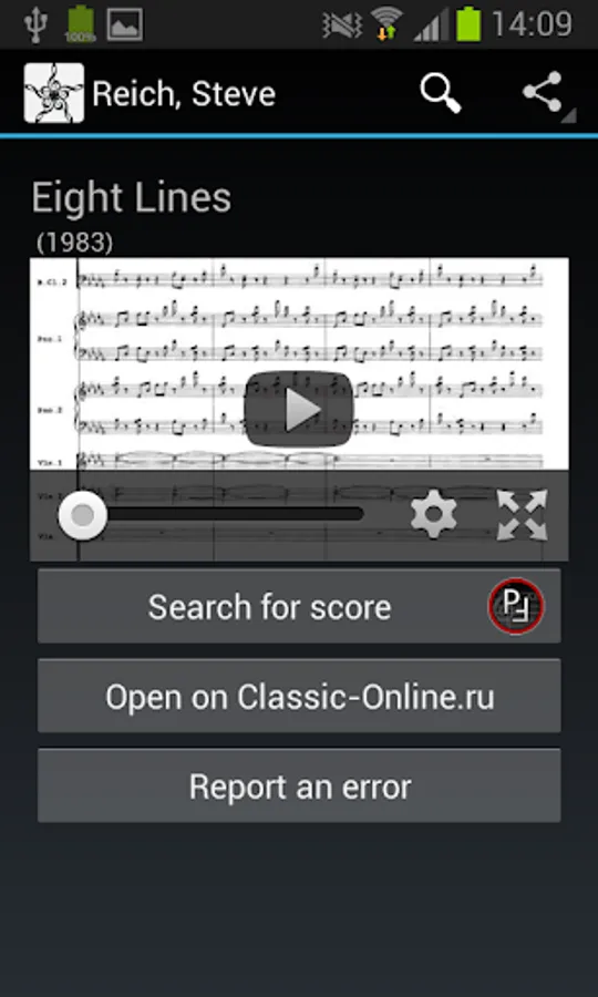 - Links to performance (audio and video) on Youtube and Classic-online.ru, quick sheet search on Pianofiles;
