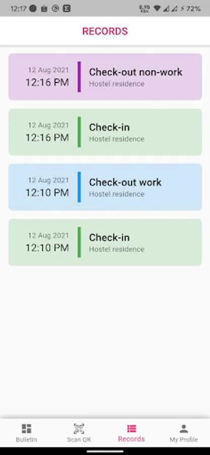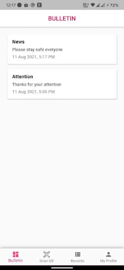 Other uses of this app includes bulletin, and record history that aim to assist user to alert on latest information from admin and keep track their own in and out history.