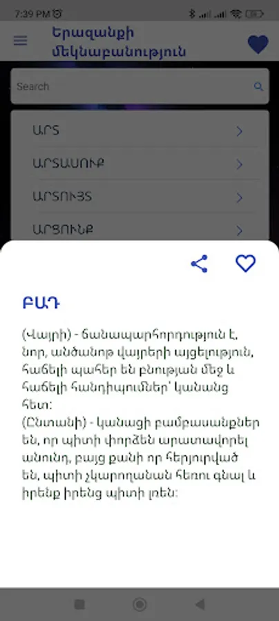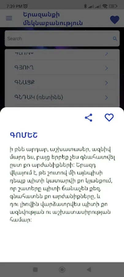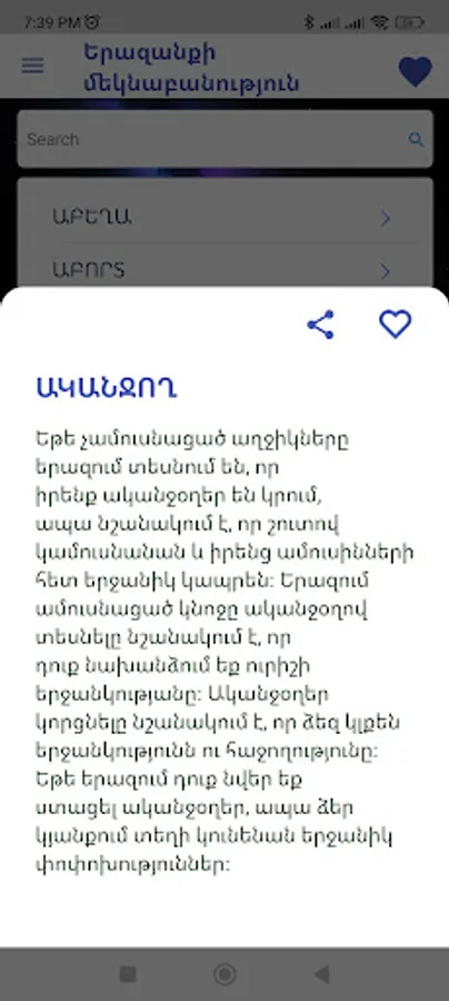 Dream interpretation-ը Android հավելված է, որն օգնում է օգտվողներին հեշտությամբ մեկնաբանել իրենց երազները: Հավելվածն ունի երազների խորհրդանիշների և դրանց իմաստների հսկայական տվյալների բազա, որը թույլ է տալիս օգտատերերին արագ որոնել այն խորհրդանիշները, որոնց հանդիպել են իրենց երազներում և ստանալ մեկնաբանություն: Բացի այդ, հավելվածն առաջարկում է երազանքների ամսագրի գործառույթ, որտեղ օգտատերերը կարող են հետևել իրենց երազանքներին և վերլուծել դրանք ժամանակի ընթացքում: