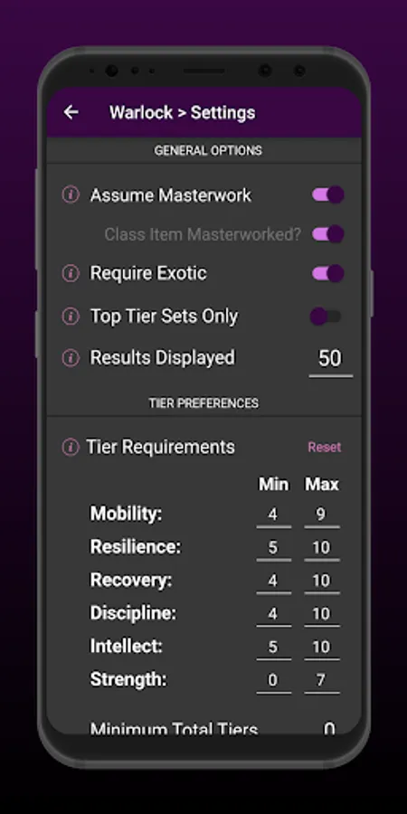 - Set min/max tiers for each stat