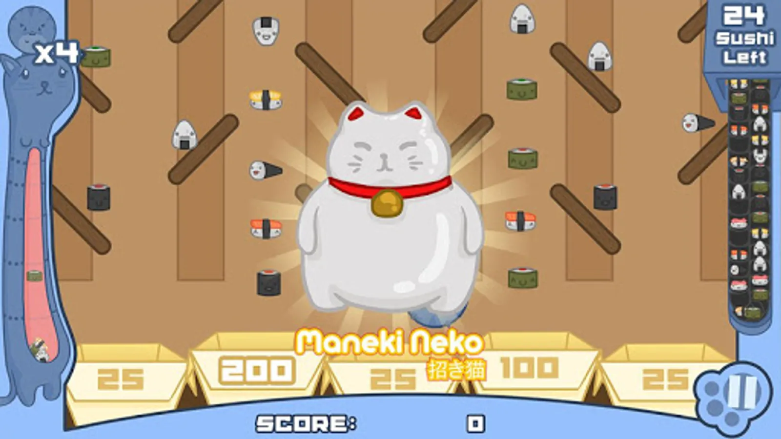 He's cuddly. He's squishy. All he needs is sushi and love. Pachinko-style physics puzzle game Sushi Cat is free on Android, with 27 levels of awesome fun for everyone. Based on the hit Flash game series loved by millions, Sushi Cat now fits in your phone for you to get your puzzle game fix on the go. In the name of love, drop your kitty from the top of the screen and watch him bounce off obstacles, nomming delicious nigiri and gathering power-ups, to meet your target goal.