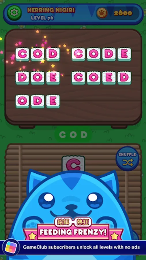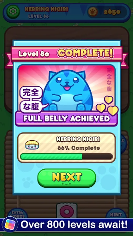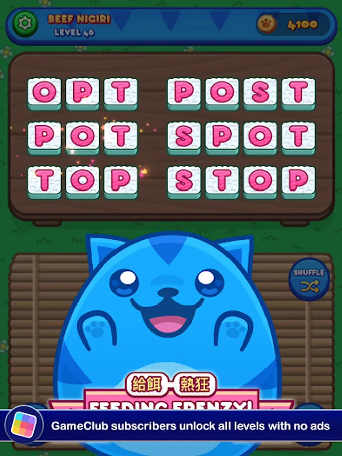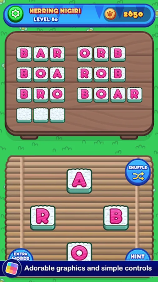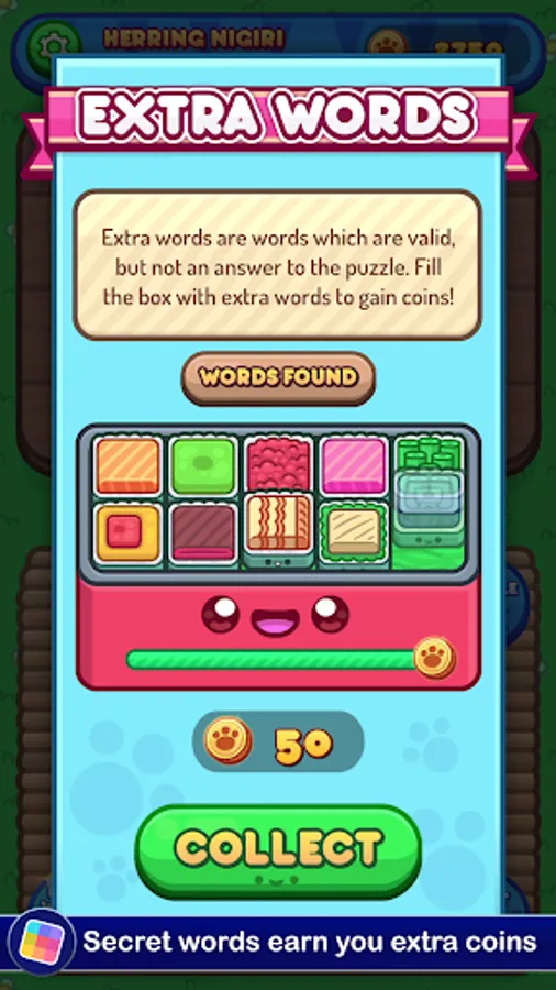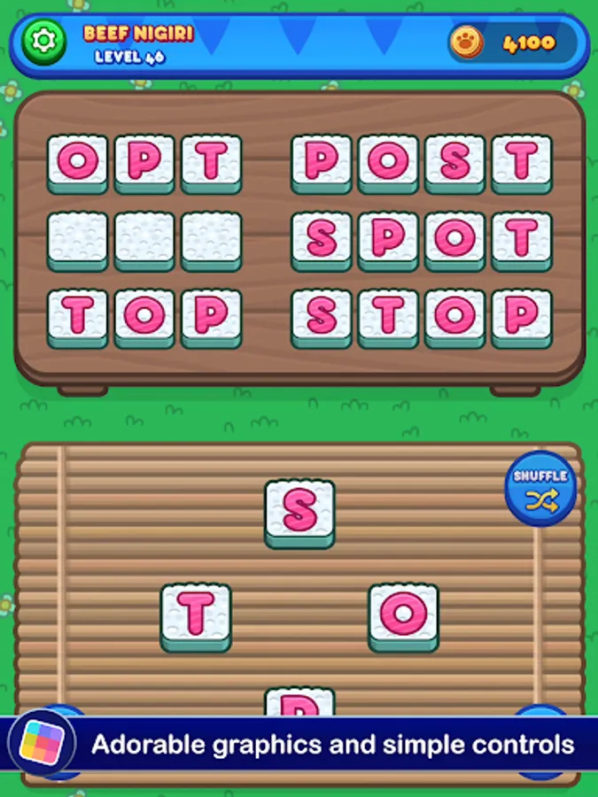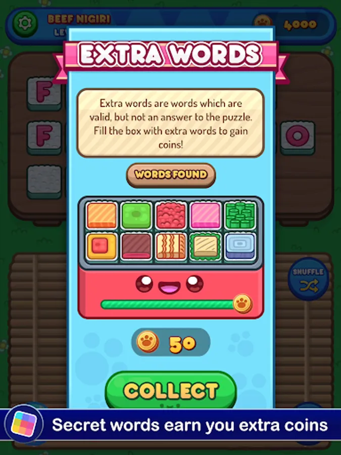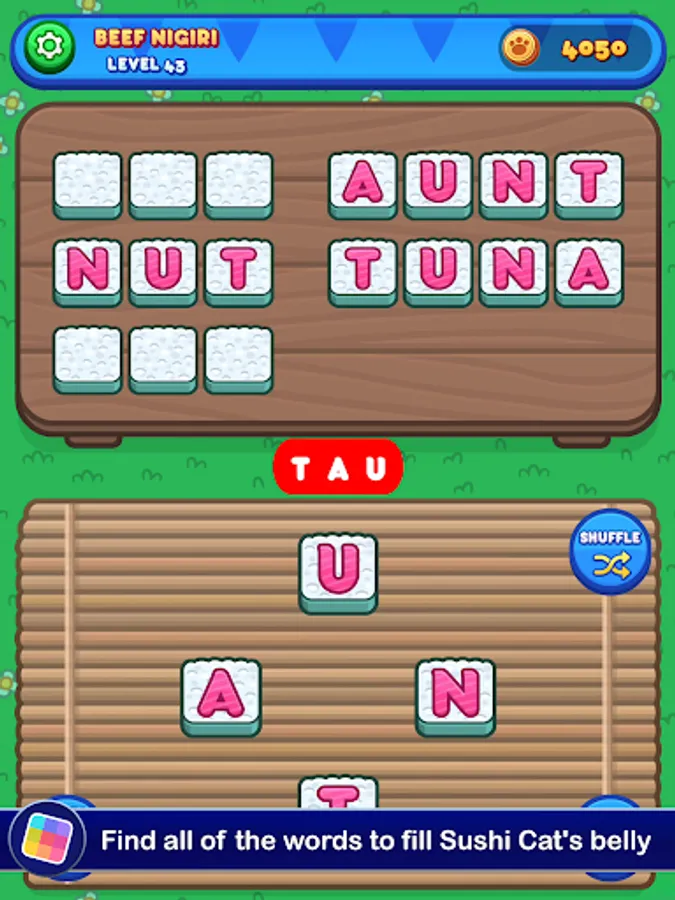 Each level gives you a set of letters you need to use to make words. There's a set menu, and you'll need to figure out all of the required words to move forward. If you run into trouble, you can get a hint in exchange for a few coins. You'll earn more as you go, but if you want to build up a stockpile you'll need to think up lots of bonus words. The bigger your vocabulary, the more food you'll be able to prepare for Sushi Cat. The more Sushi Cat eats, the happier it gets! The taste of victory has never been so fresh!