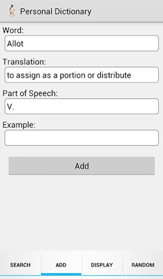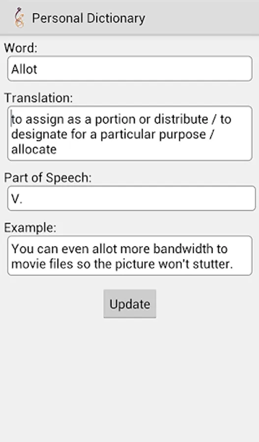 Personal Dictionary is an app to allow users to create there own language to language dictionary which helps them translate and keep a copy of there newly learned word.