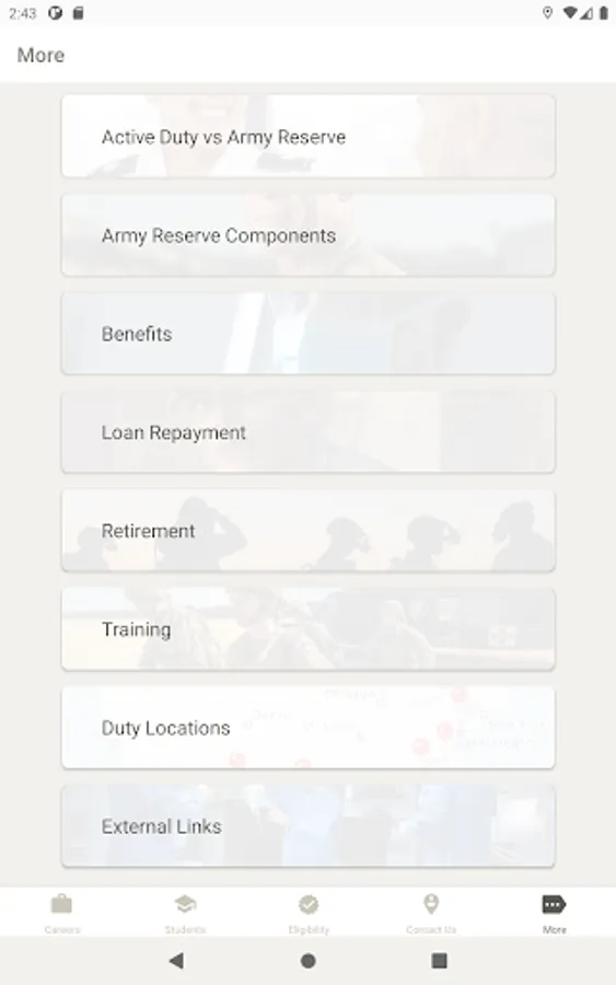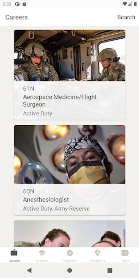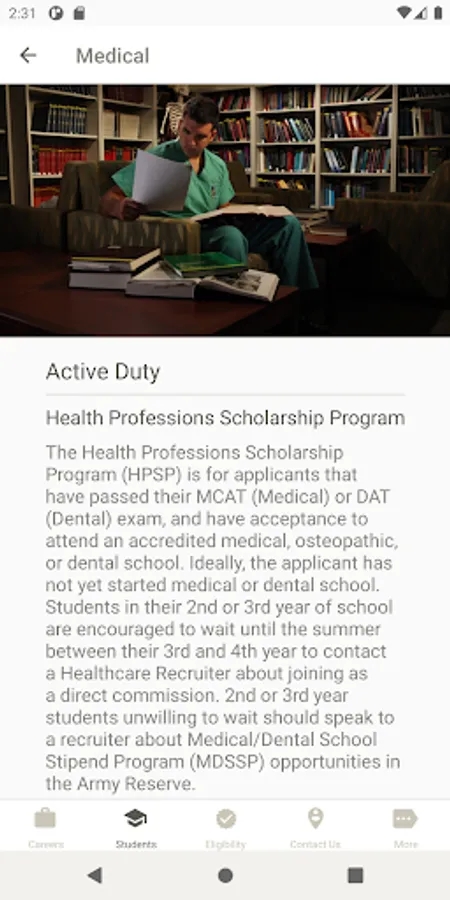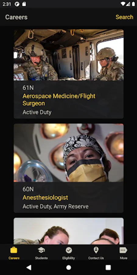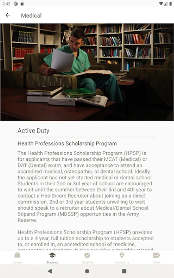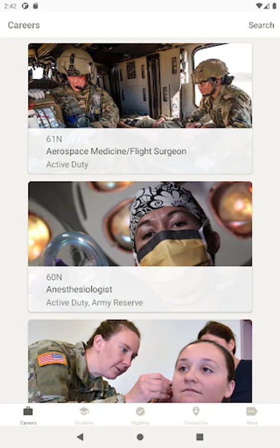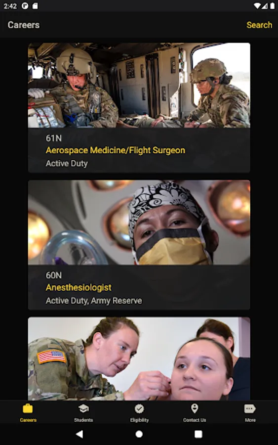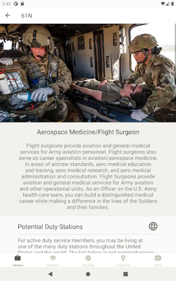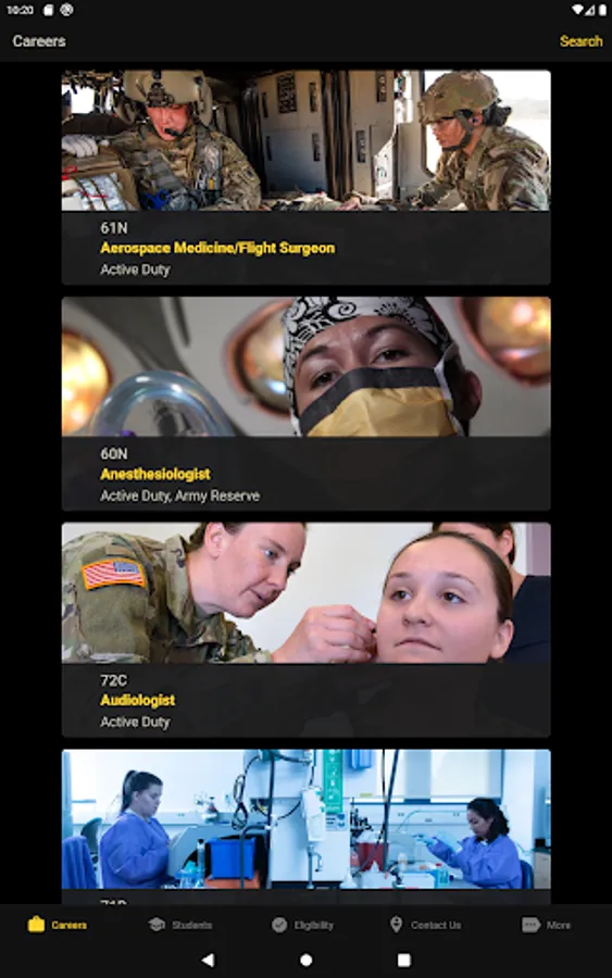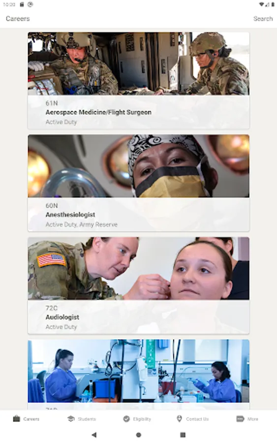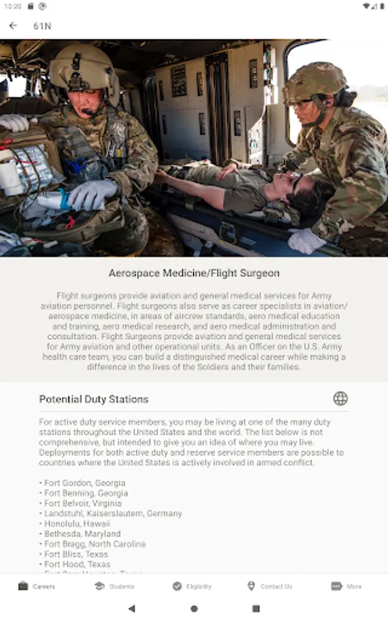 With U.S. Army Medicine Careers, you can find out about current career opportunities, check your eligibility, and get in touch with a Healthcare Recruiter. Students can browse scholarship programs, and individuals unfamiliar with the U.S. Army can find out about multiple ways to serve. And you can do it all from the comfort of your home!