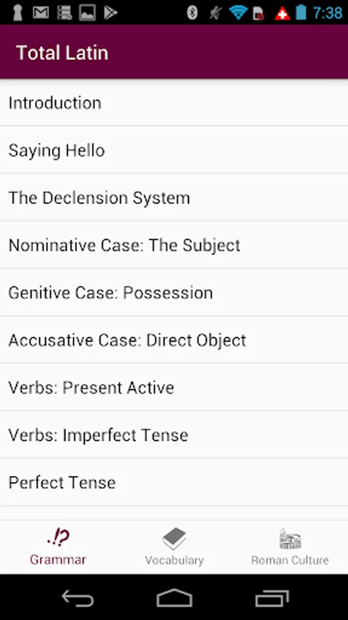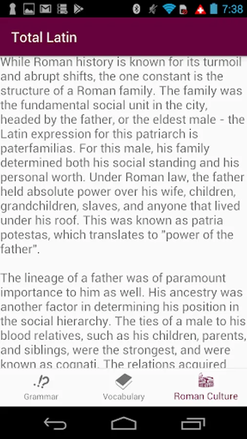 Latin is everywhere in today's society. Whether it's through the Romance languages, or through phrases like "carpe diem" and "quid pro quo", Latin is deeply ingrained into our society. Having a grasp on the language will open many doors for you. Learning the basics of Latin means that you also know the basics of other widely used languages, such as Spanish, French, Italian, Portuguese, and more. This app gives you an introduction to Latin grammar by covering topics such as the declension system and verb conjugation. In addition to grammar, this app also features a cultural section, which covers life in ancient Rome. Cultural topics talk about aspects such as the Roman family, Roman mythology, and much more. The app also has an easy to use Latin to English dictionary, to aid you in translation and sentence formation. The dictionary features over 50,000 words, and is updated daily. We have an ad-free experience with nothing locked behind in-app purchases, because we strongly believe that education should be free for everyone.