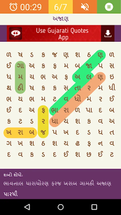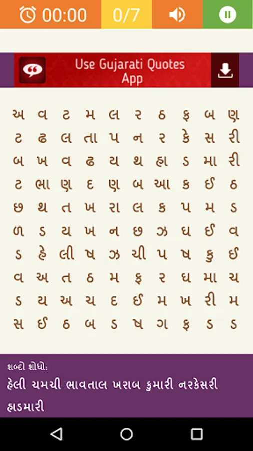 Gujarati Word Puzzle is an easy and fun game to improve the Gujarati vocabulary . It is based on the simple principle of finding hidden words from a grid of multiple characters.